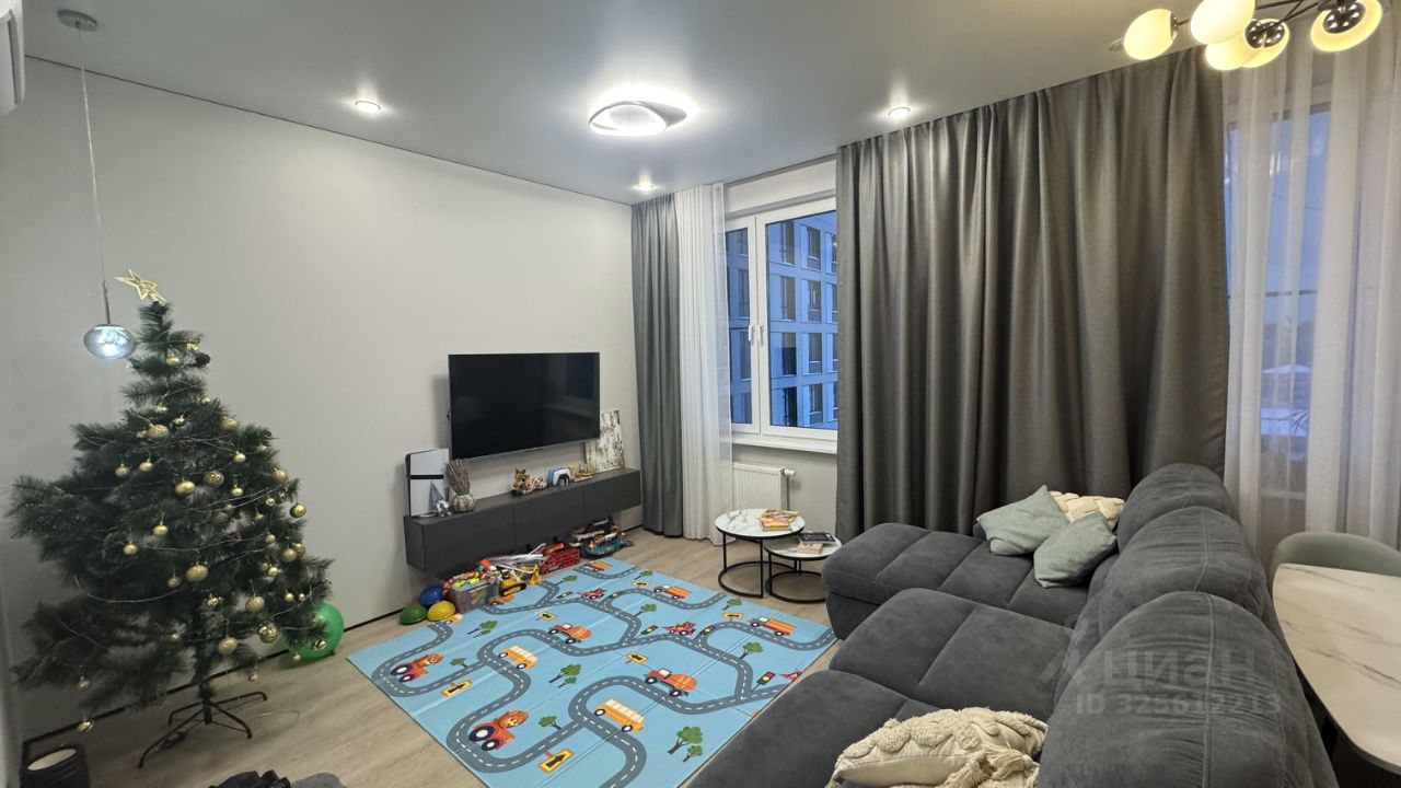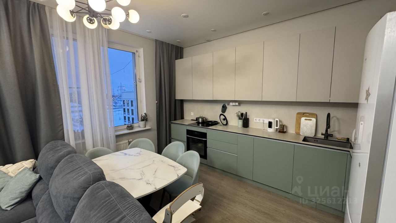 Кухня впечатляет своим современным дизайном и площадью 35 кв.м, оснащена всей необходимой техникой, включая холодильник, плиту и микроволновку. В гостиной установлен телевизор и удобный диван, а также есть обеденный стол и стулья.