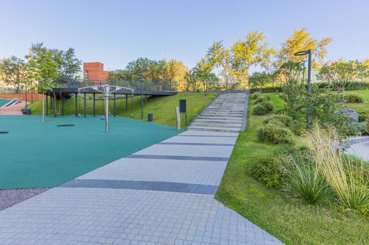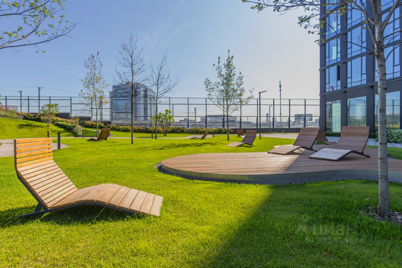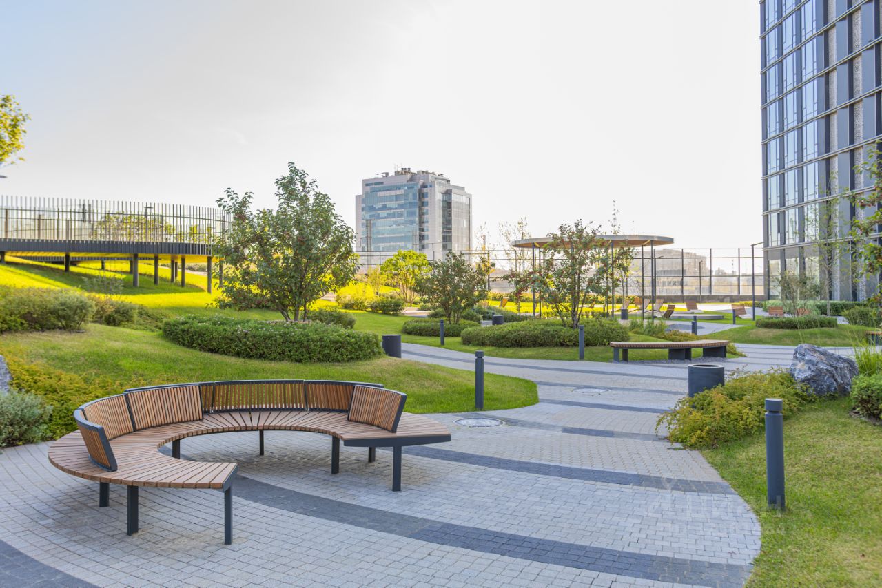 В стилобате комплекса расположены лаунж, коворкинг, фитнес, детский центр развития на 90 мест, кафе и супермаркет. В подземной части оборудован двухуровневый паркинг на 634 места с автомойкой. Территория закрыта для посторонних. Проход в здание осуществляется по биометрической системе доступа со считыванием отпечатков пальцев, а въезд в паркинг по автоматическому считыванию номеров. Во дворах предусмотрены игровые площадки с батутами, качелями и горками, спроектирован собственный сад, где устроены прогулочные дорожки, амфитеатр и зона воркаута. Отдельно предусмотрена зона барбекю. Проект благоустройства включает площадки для йоги, места для выгула собак и велодорожку с выездом к реке. На всей территории wi-fi-покрытие и места с usb-зарядками для ноутбуков.