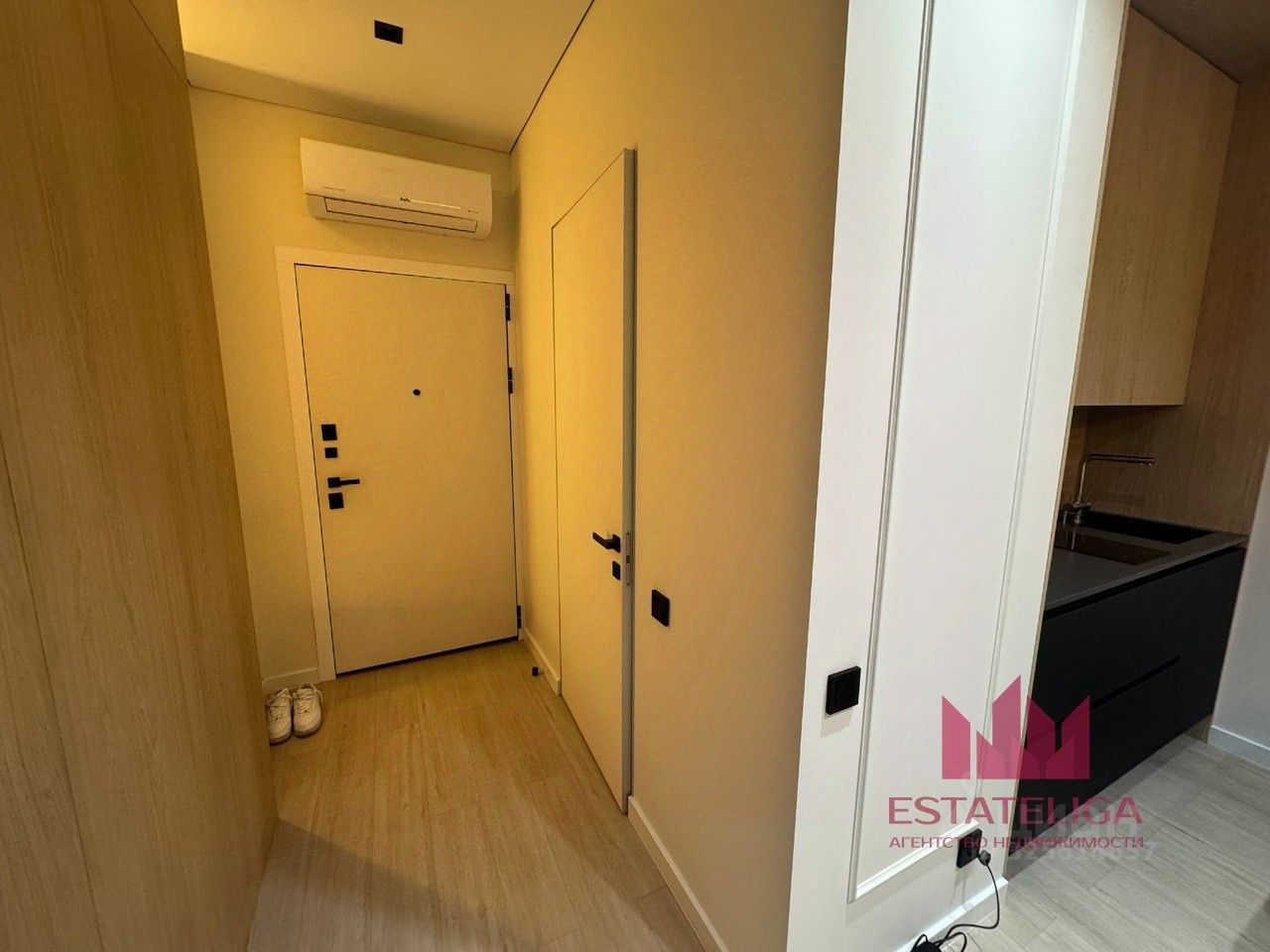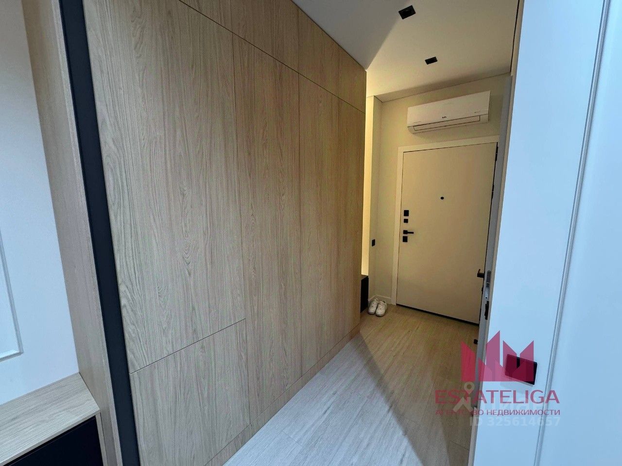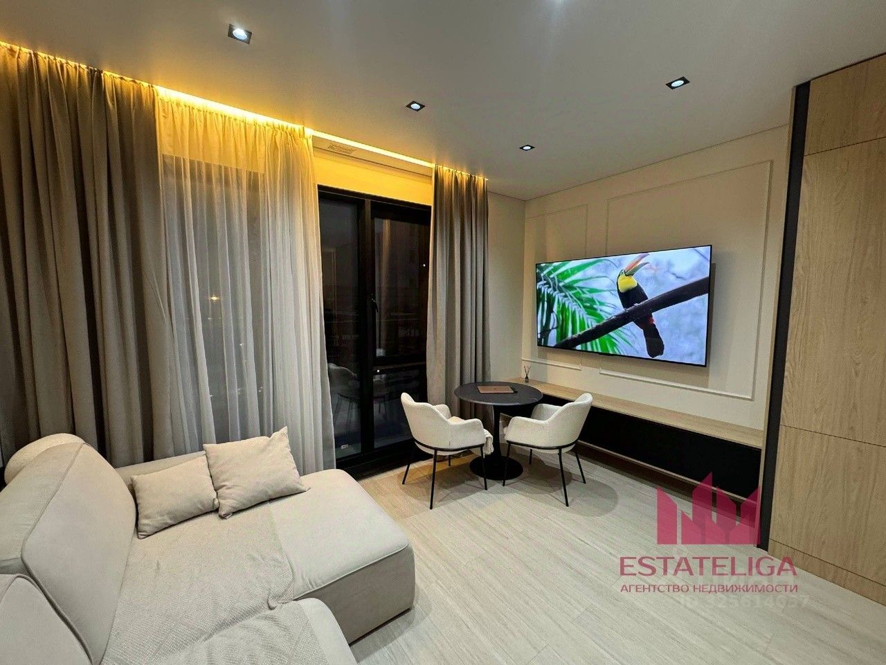• Встроенная мебель, изготовленная на заказ • Столешницы на кухне и в санузле — натуральный камень • Теневой потолок, современное сценарное освещение • Кондиционер