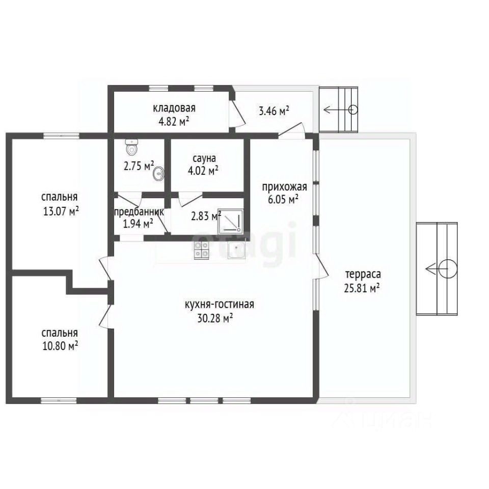 Этот современный дом предлагает комфорт и уют: две просторные спальни с большими кроватями, а также светлая гостиная, объединённая с кухней, создают идеальное пространство для семейных встреч и дружеских посиделок. Вы сможете наслаждаться отдыхом в собственной сауне, а также оценить преимущества наличия скважины и септика.