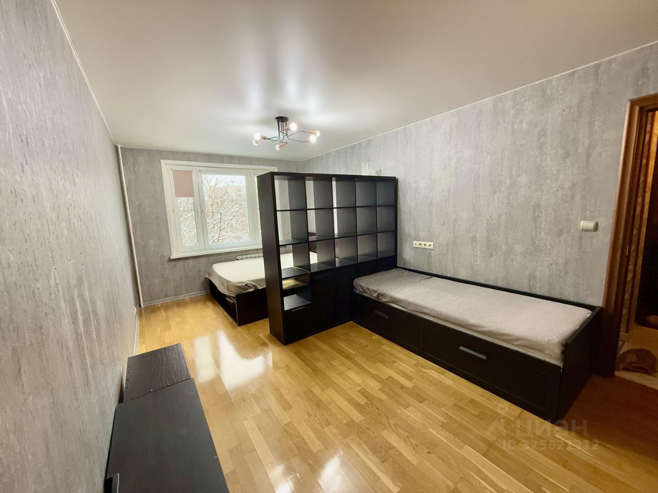 Уютная просторная комната, светлая засчет большого окна, из которого открывается вид на улицу Вешняковская. Кровать, диван и стеллаж Икеа, вместительный шкаф. Площадь комнаты 18,8 кв м.