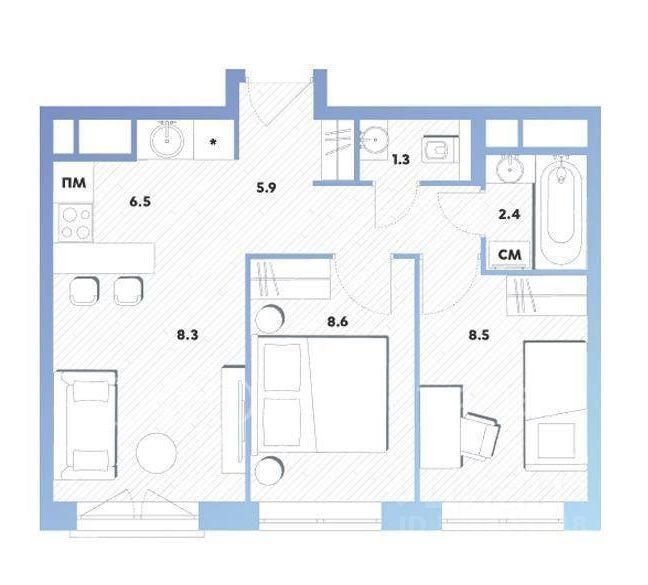 Двухкомнатная квартира в новом ЖК Баланс на Окской. Планировка евро-3 (кухня-гостиная и две спальни).