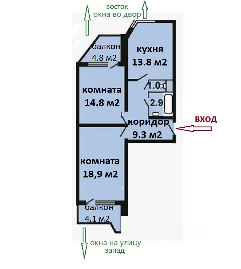 ПЛАНИРОВКА: Распашонка, окна на разные стороны дома Общая площадь 60,5 м2 (с двумя балконами - 69,4 м2) Комнаты изолированные - 14,818,9 м2 Большая кухня правильной формы 13,8 м2 Раздельный санузел Два застекленных балкона 4,8 и 4,1 м2