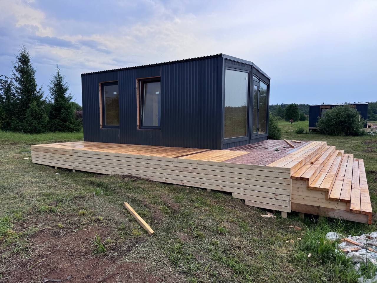 •Силовой каркас из сухой доски камерной сушки, обработанной огнебиозащитой. •Внешняя отделка: комбинированная вертикальная имитация бруса (сорт АВ, ширина 140 мм, толщина 20 мм) и профлист (RAL 7024). •Остекление: ПВХ профиль 70 мм с тройным остеклением и двухкамерным стеклопакетом. •Утепление: минеральная вата (150 мм). Пароизоляционные и защитные материалы. •Внутренняя отделка: стены вертикальная имитация бруса (сорт АВ), полы OSB 20мм с ламинатом 33 класса, потолок имитация бруса (сорт АВ). •Электропроводка скрытая, с применением кабеля ВВГнг ГОСТ в защитной гофре. Интерьерные светильники и розетки.