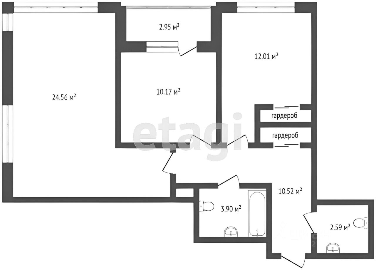 Планировка: - Просторная кухня 24 кв.м, оборудованная мебелью и техникой - 2 полноценные комнаты, укомплектованные мебелью и техникой - Удобный санузел с ванной и инсталляцией - Балкон - Гардеробная - Прихожая