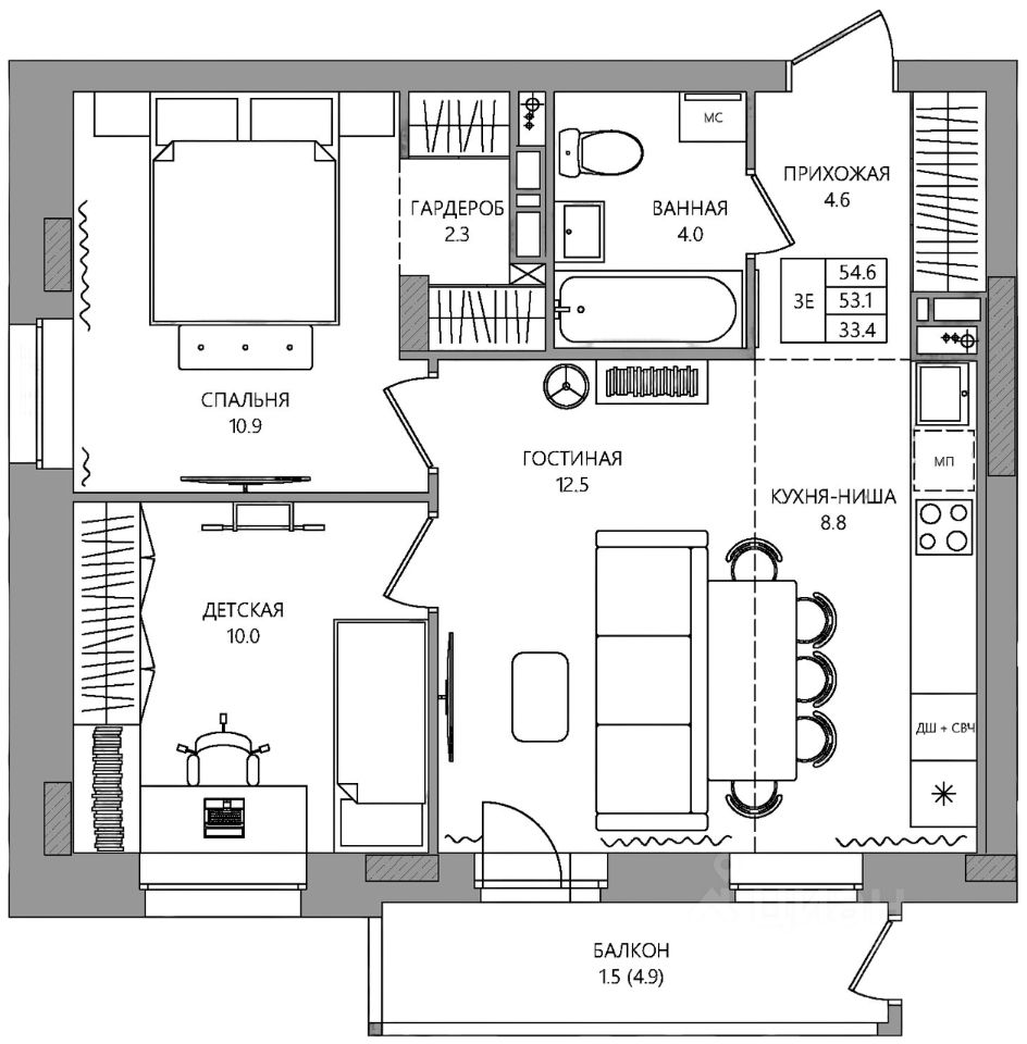 Общая площадь54,6 м2