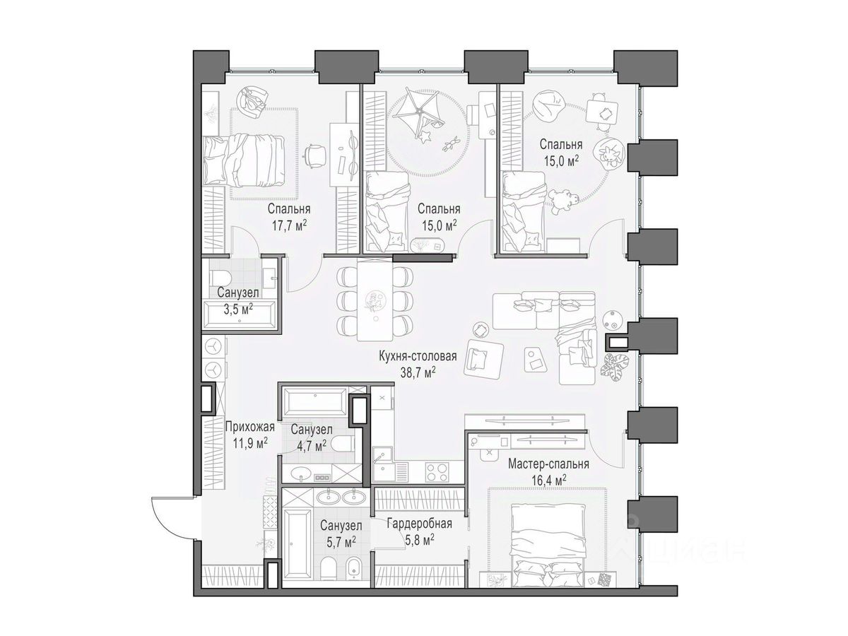 Просторная светлая квартира площадью 135,4 кв. м с окнами на северной и западной сторонах. Из просторной кухни-гостиной (39,6 кв. м) открывается вид на Останкинскую башню, а панорамное остекление делает его особенно зрелищным. Продуманная планировка позволяет разместить три спальни, выходящие окнами в сторону парка ''Красногвардейские пруды''. В мастер-спальне предусмотрены просторная гардеробная и санузел с окном.