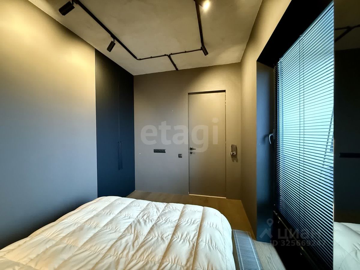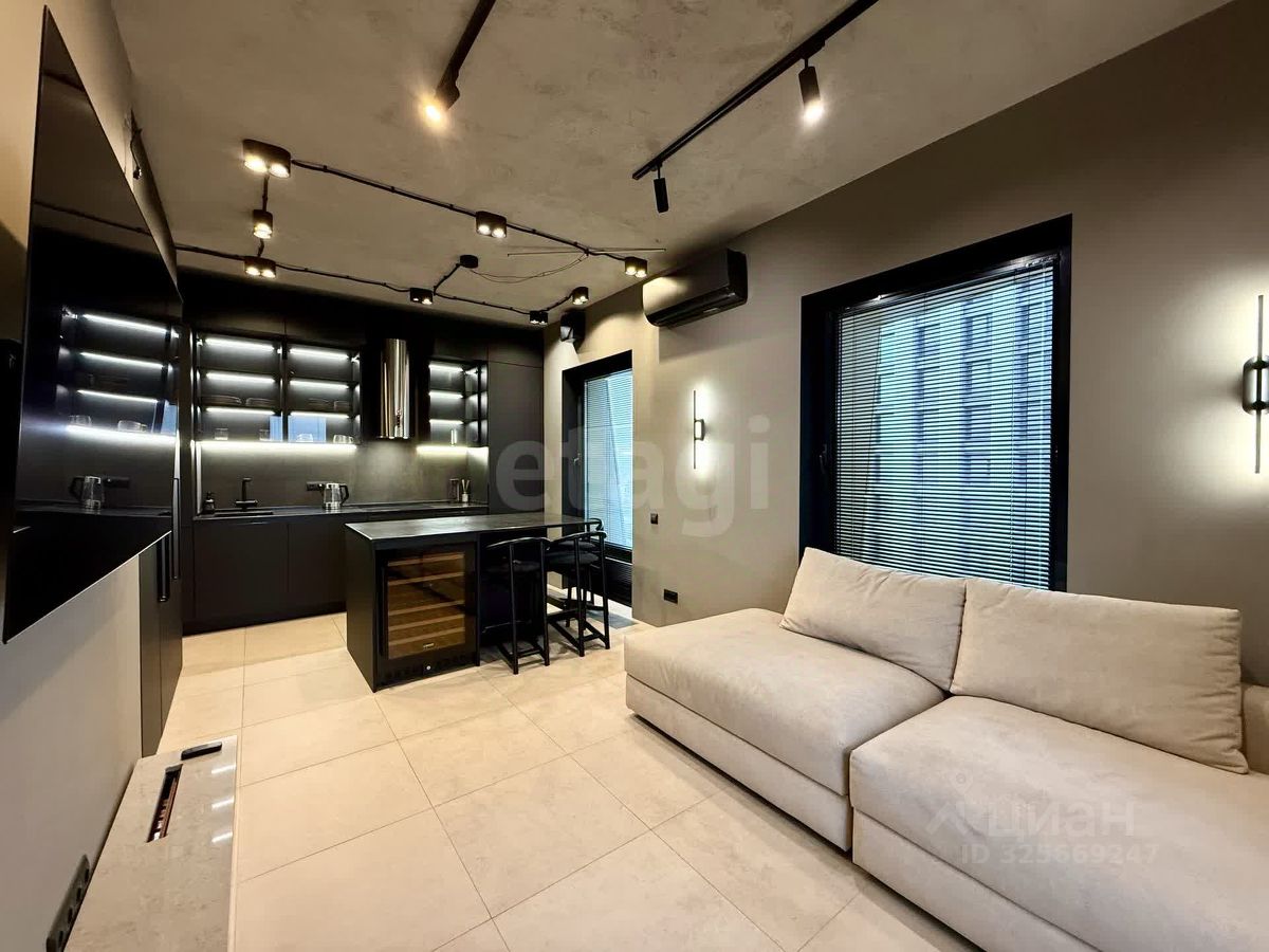 Спальня выделена в отдельную комнату. Остальное пространство зонировано под кухню-гостинную с мягкой зоной. В квартире сделан евроремонт, установлена необходимая качественная мебель и техника.