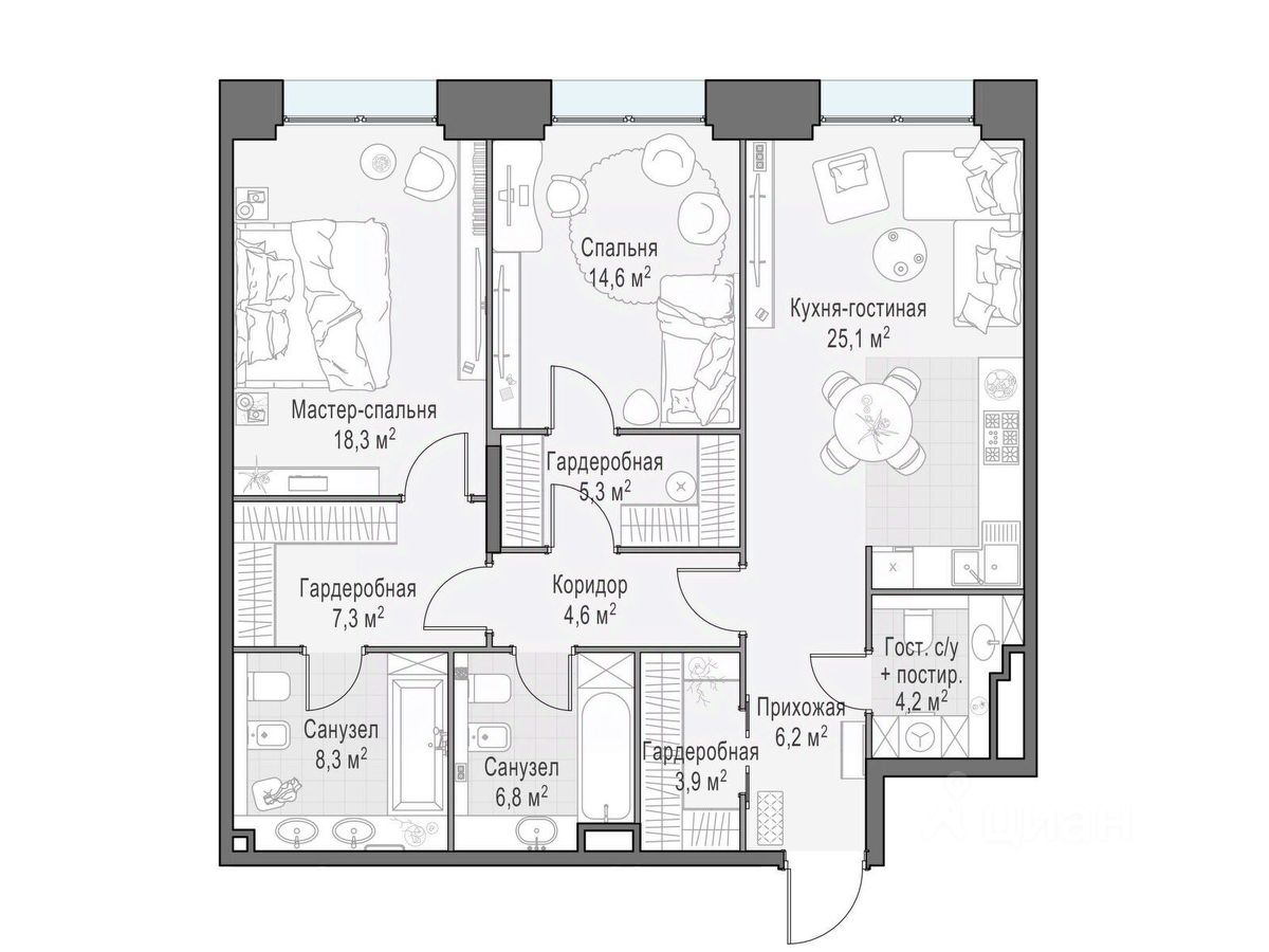 Просторная светлая квартира площадью 105,3 кв. м, обращённая окнами в сторону парка ''Красногвардейские пруды''. Панорамное остекление улучшает видовые характеристики квартиры. Продуманная планировка позволяет разместить приватную спальню с отдельными гардеробными и санузлами, спальню с отдельным гардеробом и просторную кухню-гостиную.