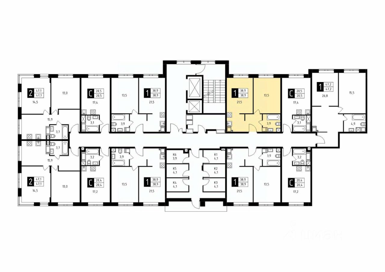 Продаётся 1-комнатная квартира в строящемся доме (Корпус 6), срок сдачи: 2-кв. 2026, общей площадью 38.90 кв.м., на 13 этаже.