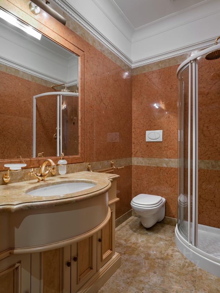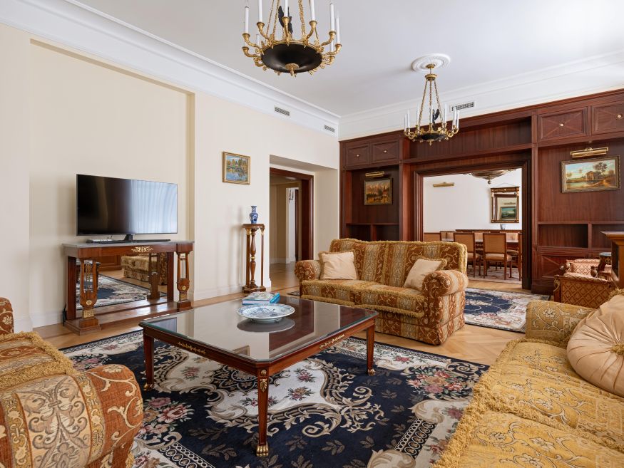 КВАРТИРА в стиле ампир является проектом известного итальянского архитектора Carlo Peis. Изыскано обставлена итальянской мебелью по индивидуальному заказу и украшена коллекцией антиквариата и картинами русских живописцев, а также предметами декора от Aubusson, Albizzi, Cappellini. Интерьер был опубликован в известных журналах Salon Interior и Salon Deluxe.
