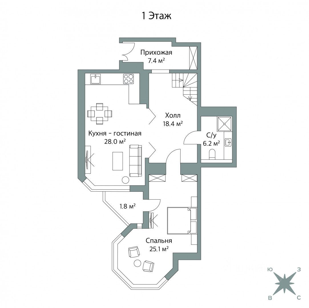 1 ЭТАЖ: просторная кухня-гостиная, спальня/кабинет с эркером, зона прихожей и холла, санузел.