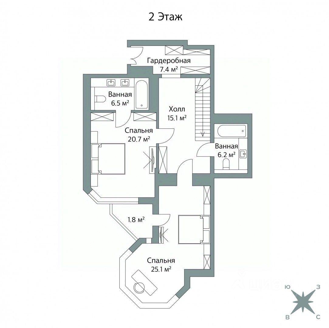 2 ЭТАЖ: мастер-спальня с собственным с/у, спальня/детская с эркером, холл, гардеробная, санузел.
