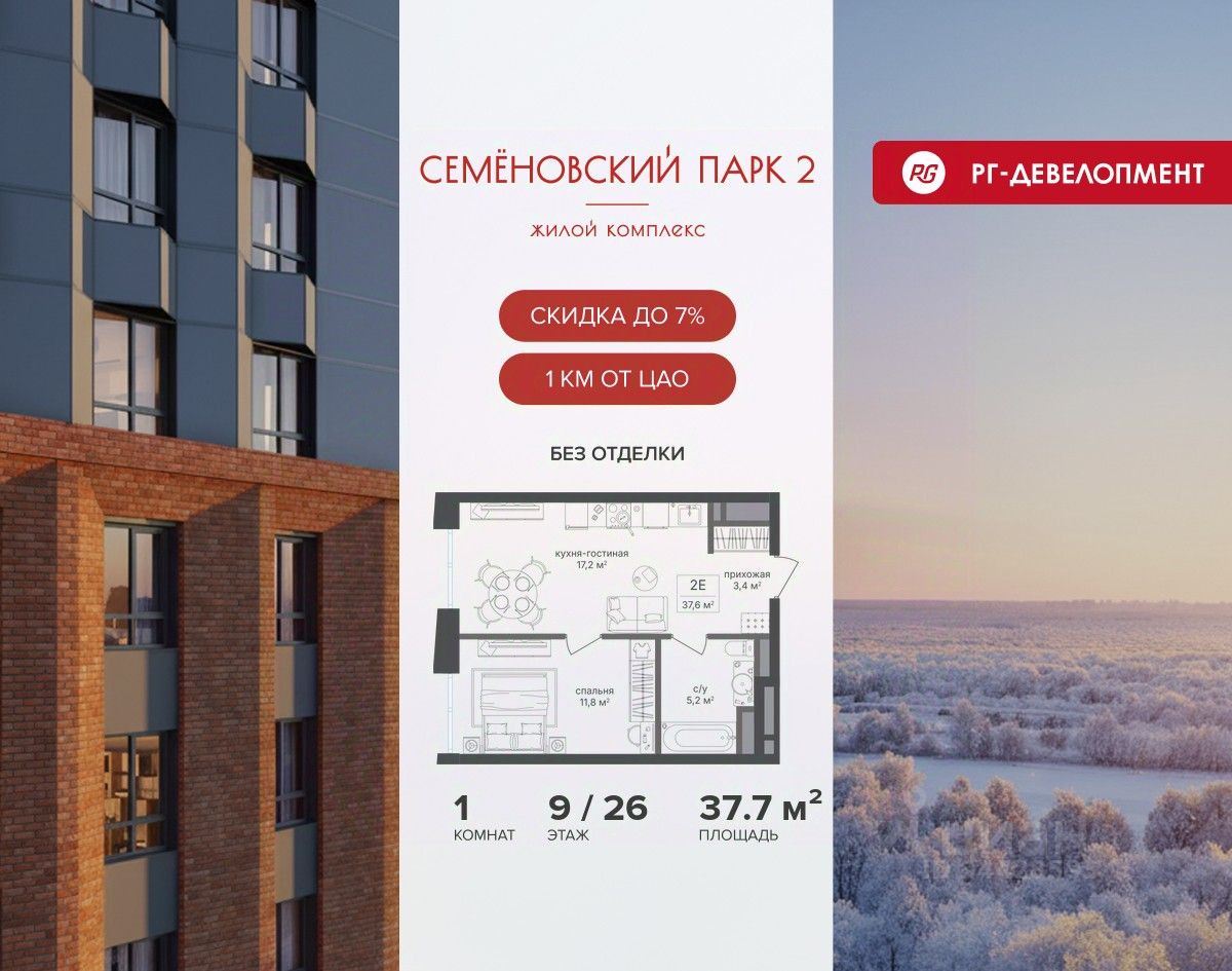 Продается 1-к квартира 37,6 кв.м. в ЖК ''Семеновский парк 2'' на 9-м этаже 26 этажного дома.