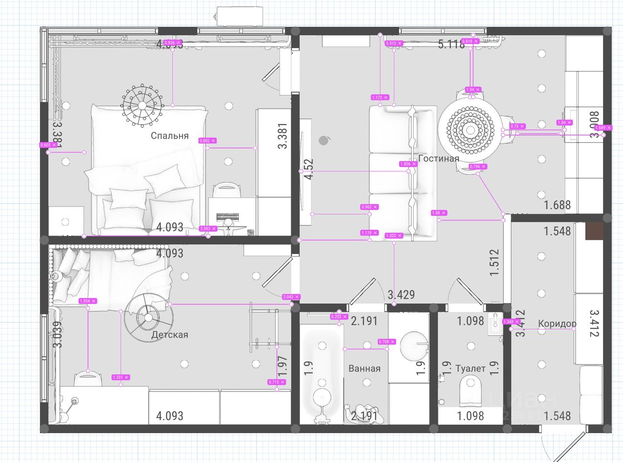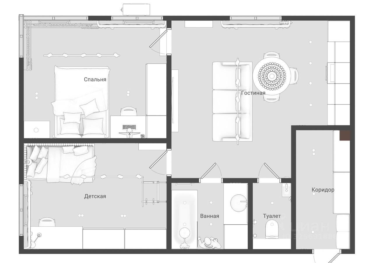 Квартира 2-х комнатная или евро 3, с совмещенной кухней-гостиной, раздельным санузлом, спальней, детской (которая, с учетом электрики, спланирована как для детского, так и для подросткового возраста, так же может служить отдельным кабинетом). Квартира находится в долевой собственности (по 1/2, два взрослых собственника) с 2019 года.