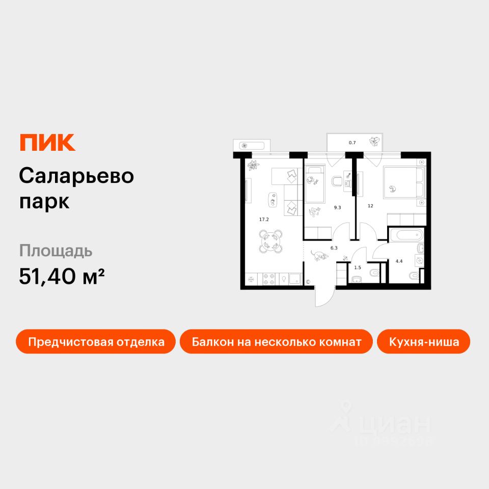 Продаётся 2-комн. квартира площадью 51,4 кв.м на 7 этаже 22 этажного дома (Корпус 57.3, Секция 3) проекта ПИК Саларьево парк. Светлый просторный подъезд на уровне земли, функциональная планировка, большие окна, предчистовая отделка.