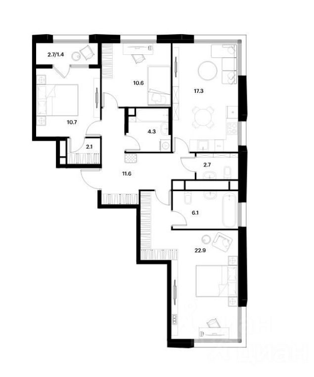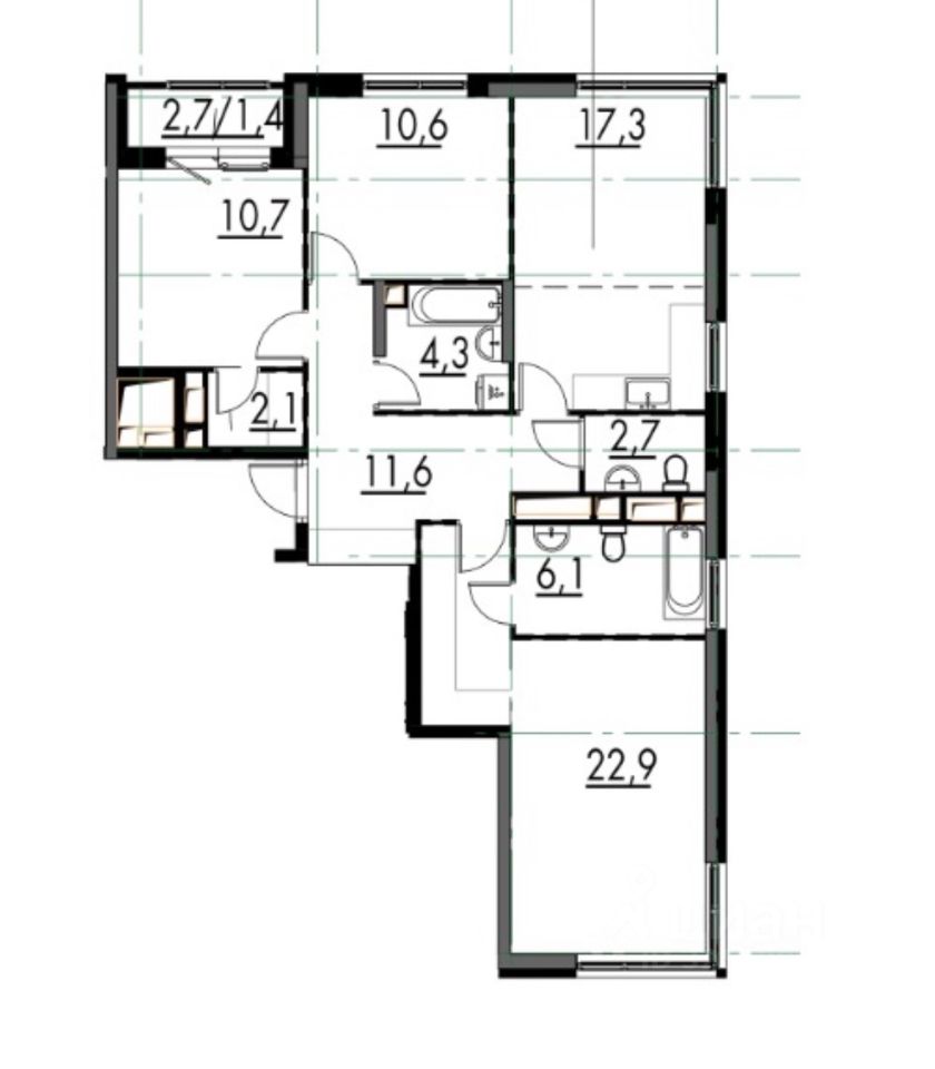 3-х комнатная торцевая квартира в кирпично-монолитном доме с угловым остеклением и с видом на 3 стороны, изолированная планировка: мастер-спальни, гардеробные, просторная кухня-гостиная, ванная с окном, лоджия, потолки 3 м.