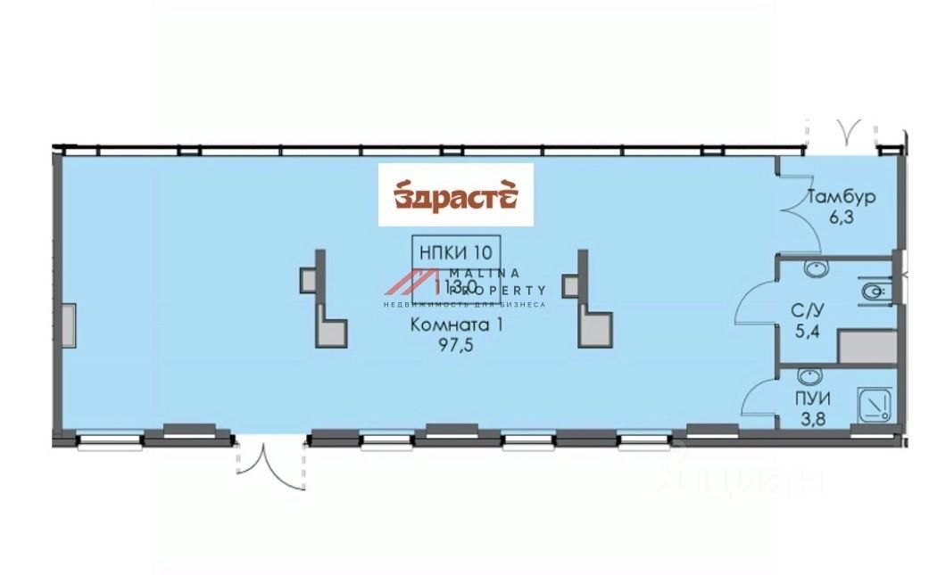 Помещение 113 м2, располагается на 1 этаже, открытая планировка, отдельный вход с фасада, высота потолка 3,5 м, витринные окна по фасаду. Электрическая мощность 25 кВт. Парковка перед фасадом. Место для размещения рекламы.