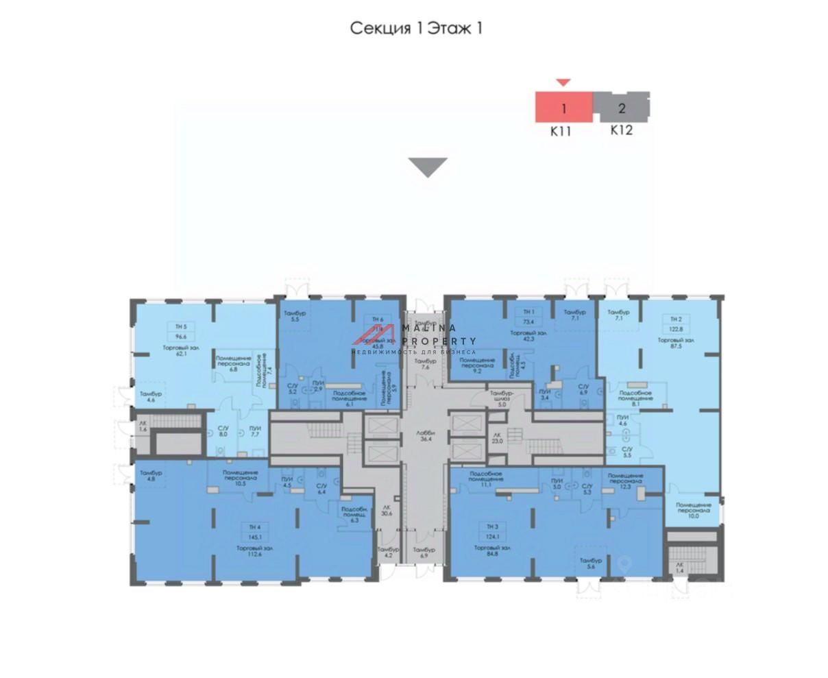 Помещение 96,6 м2, располагается на 1 этаже, открытая планировка, отдельный вход с фасада, высота потолка 3,5 м, витринные окна по фасаду. Электрическая мощность 19 кВт. Парковка перед фасадом. Место для размещения рекламы.