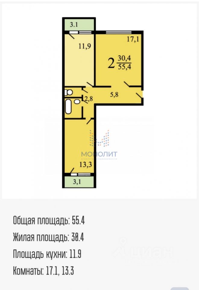 Удобная планировка - ''распашонка'' Изолированные комнаты 17.1м² и 13.3м² Просторная кухня 12 м² — место для семейных обедов и дружеских посиделок. Раздельный санузел (полноценная ванная комната и туалет). Два балкона по 3м² : из кухни и из комнаты. Высота потолков 2,64 м Удачный 4 й этаж в 14-этажном доме.