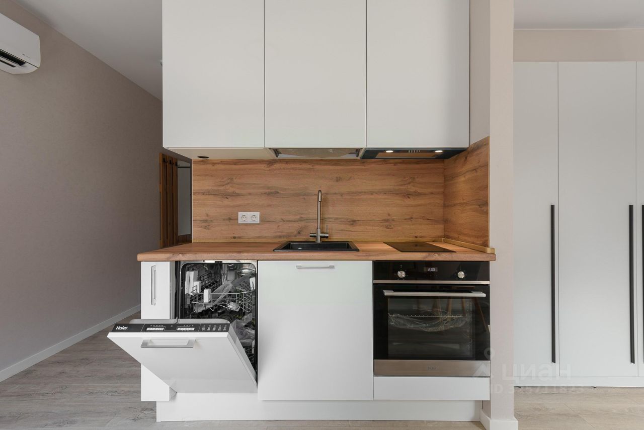 Квартира с интерьером в стиле сканди, с мебелью и техникой: - кухня с посудомойкой и духовкой - раскладной диван - телевизор и полка с делениями для хранения - стиральная машина - предметы интерьера