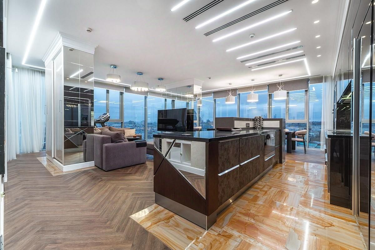 Видовая квартира на высоком этаже легендарного дома на Цветном бульваре. Панорамы открываются сразу в трёх направлениях: Москва-Сити, Храм Христа Спасителя, Кремль — весь город как на ладони.