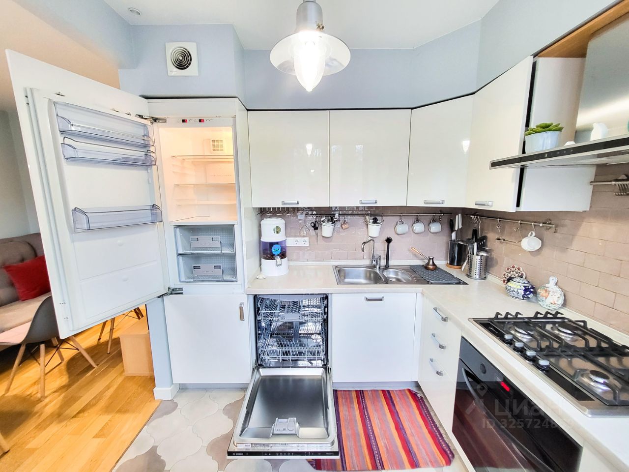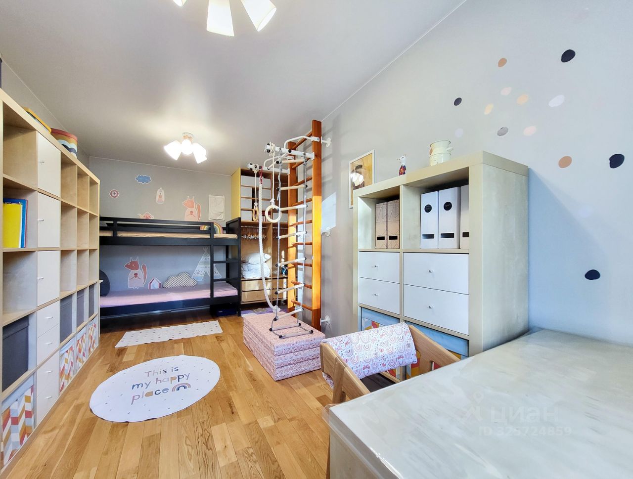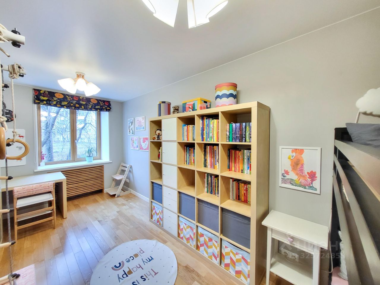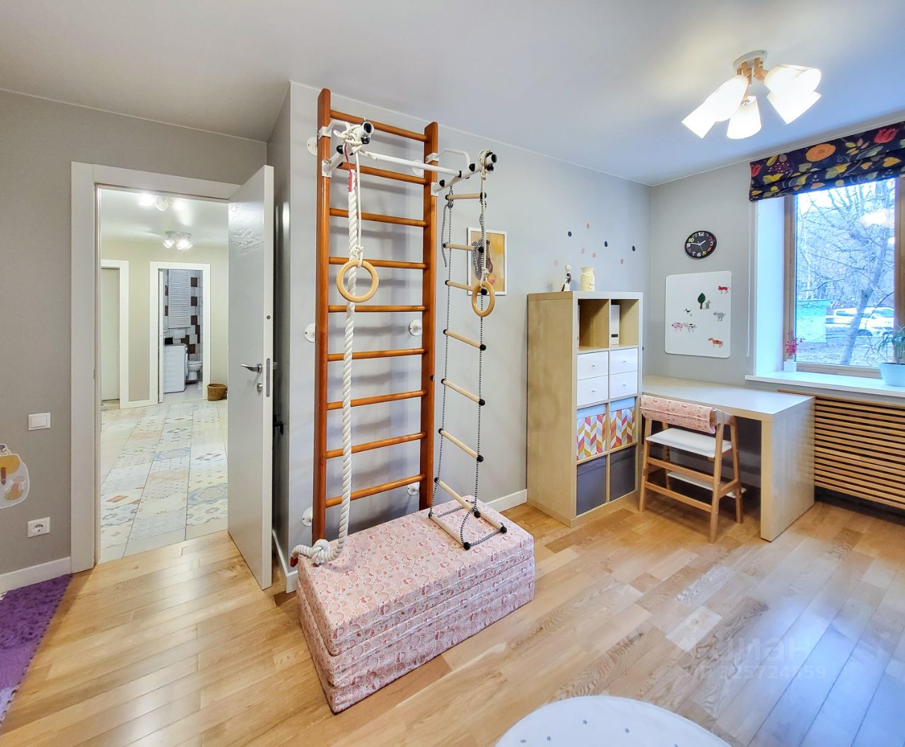 Уютная и функциональная 3-комнатная квартира в кирпичном доме Исторический центр Москвы, район Бауманская 60 м² Планировка: кухня-гостиная + изолированная спальня и детская Все окна выходят в парк Дом расположен на второй линии — тихо и зелено Просторная детская комната Полностью оборудована: шведская стенка, книги, игрушки, вместительный шкаф Двухъярусная кровать с ортопедическими матрасами Спальня Панорамное окно в пол, выход на открытый балкон Балкон оборудован для отдыха в тёплое время года Двуспальная кровать с ортопедическим матрасом, шкаф Кухня-гостиная Полностью укомплектована техникой и посудой Раздвижной стол, детские растущие стулья Большой экран, Apple TV Просторный коридор с проду