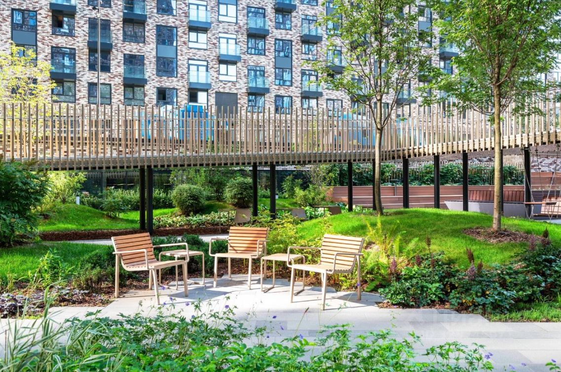 Пешеходный мост делит территорию на автономные зоны: амфитеатр, лаундж-зоны, игровые локации и места для работы на свежем воздухе.