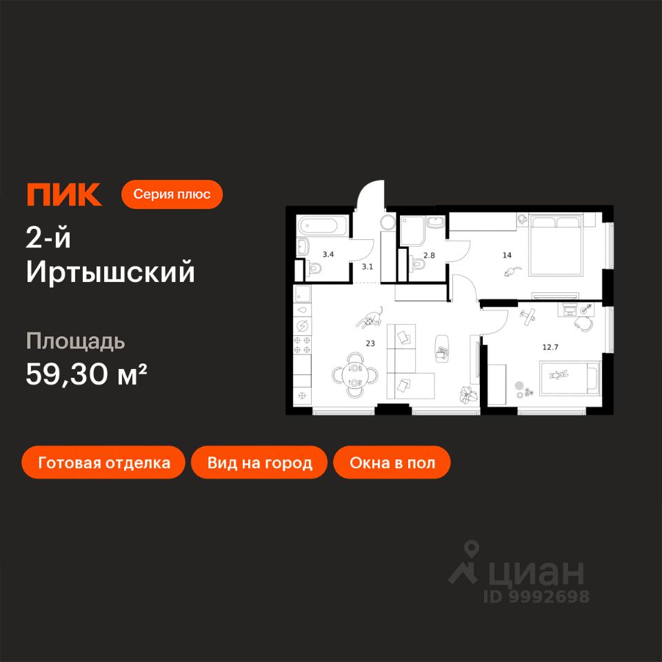 Продаётся 2-комн. квартира площадью 59,3 кв.м на 30 этаже 43 этажного дома (Корпус 1.1, Секция 1) проекта ПИК 2-й Иртышский. Светлый просторный подъезд на уровне земли, функциональная планировка, большие окна, c отделкой.