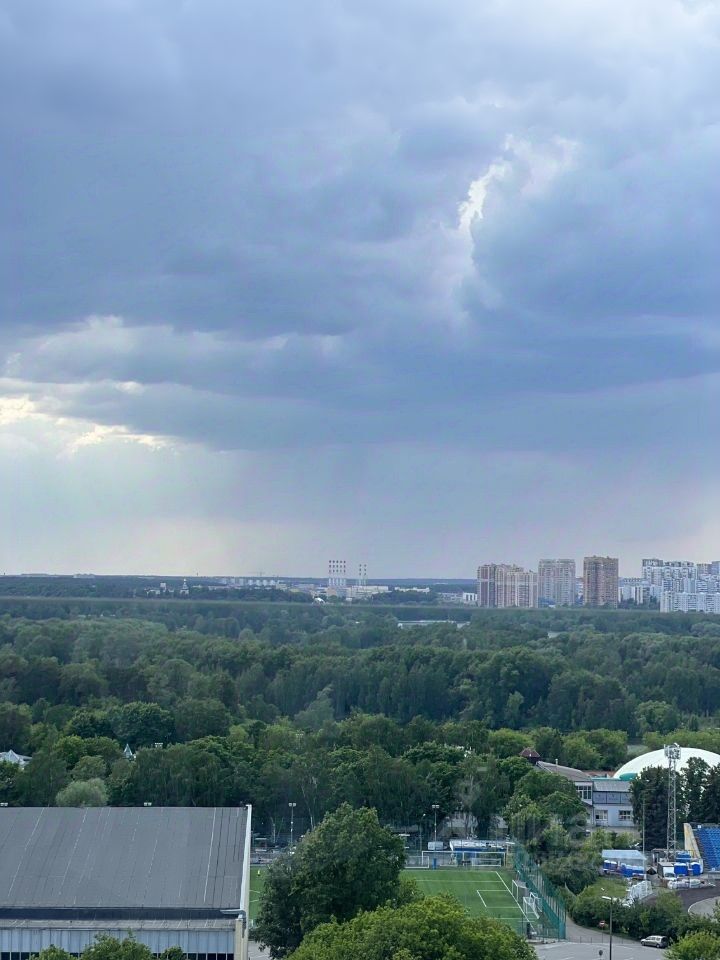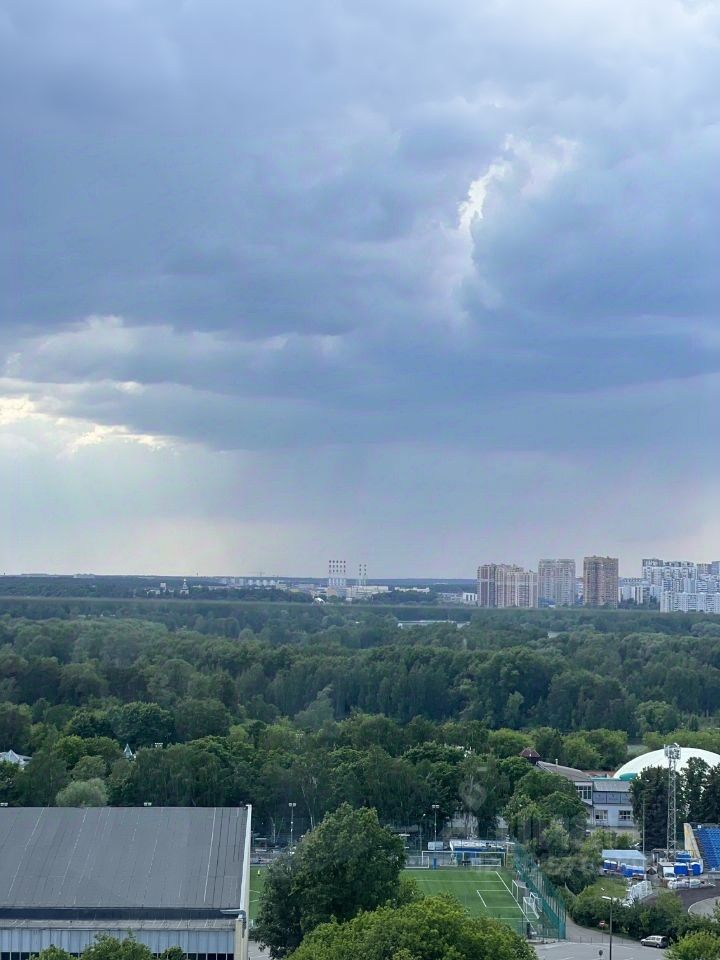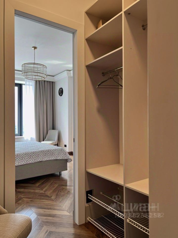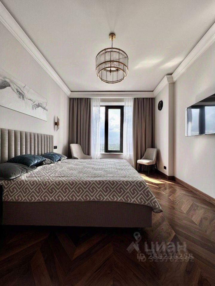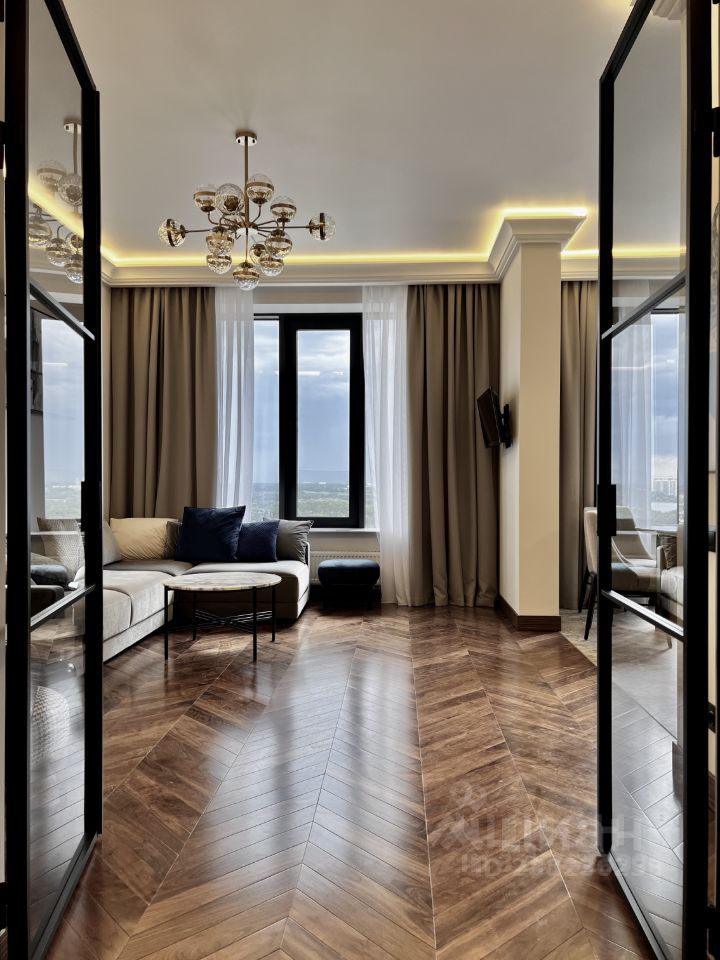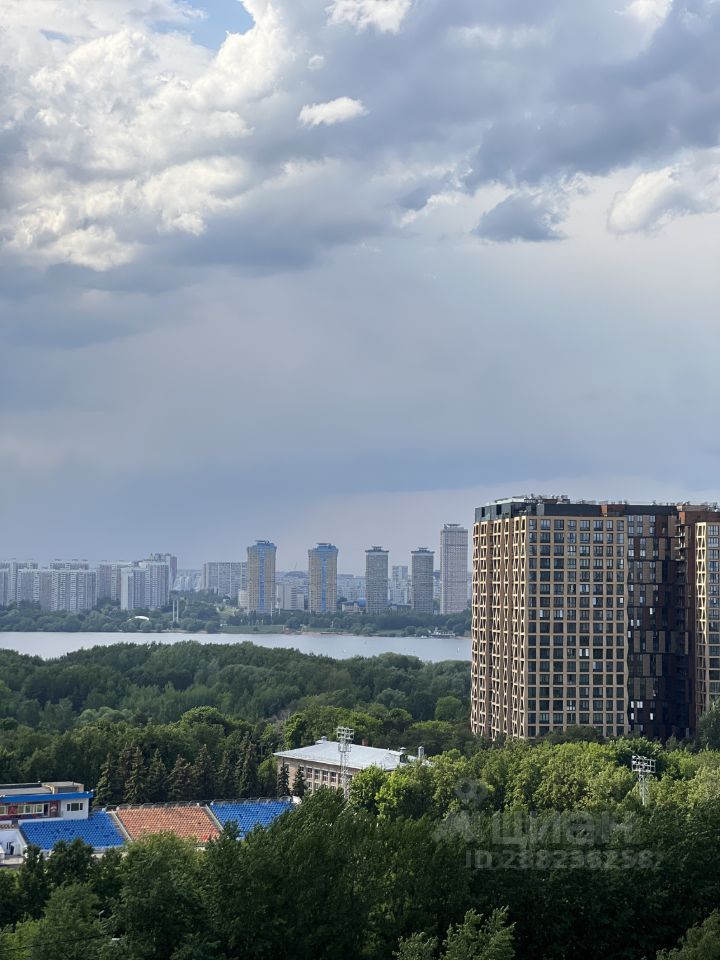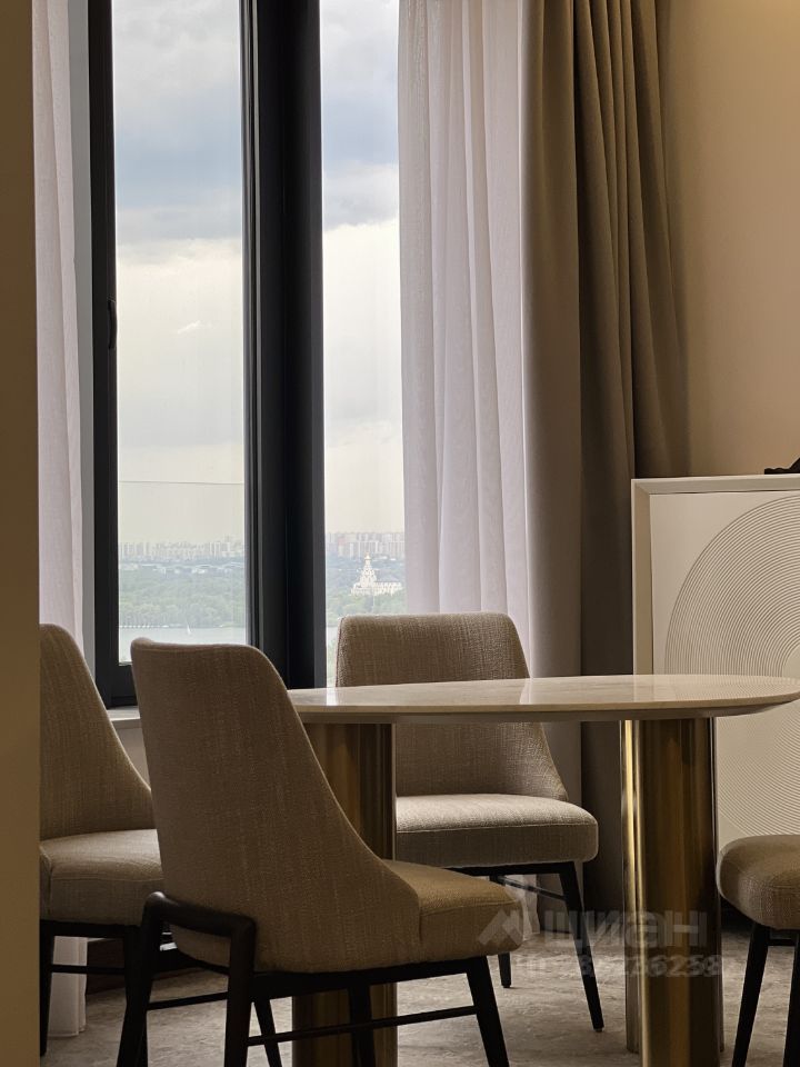 Квартира обладает высокими потолками и панорамными окнами, выходящими на запад (вид на Серебряный бор).