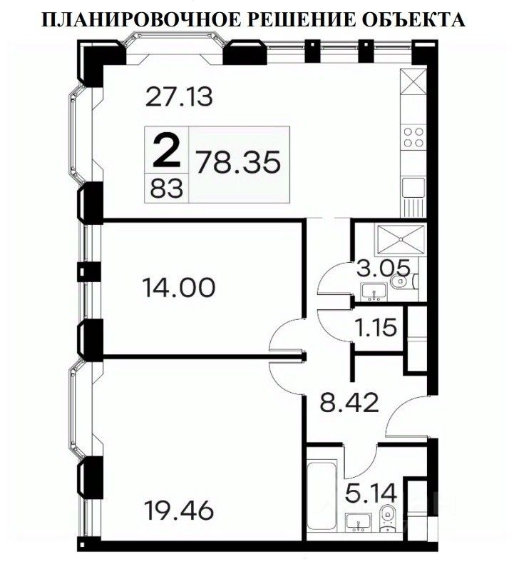 Сторона, противоположная от железнодорожных путей, угловая секция на две стороны здания. Рядом однокомнатный апартамент, есть возможность увеличить площадь до 132 метров. Апартаменты сдаются с отделкой White Box.