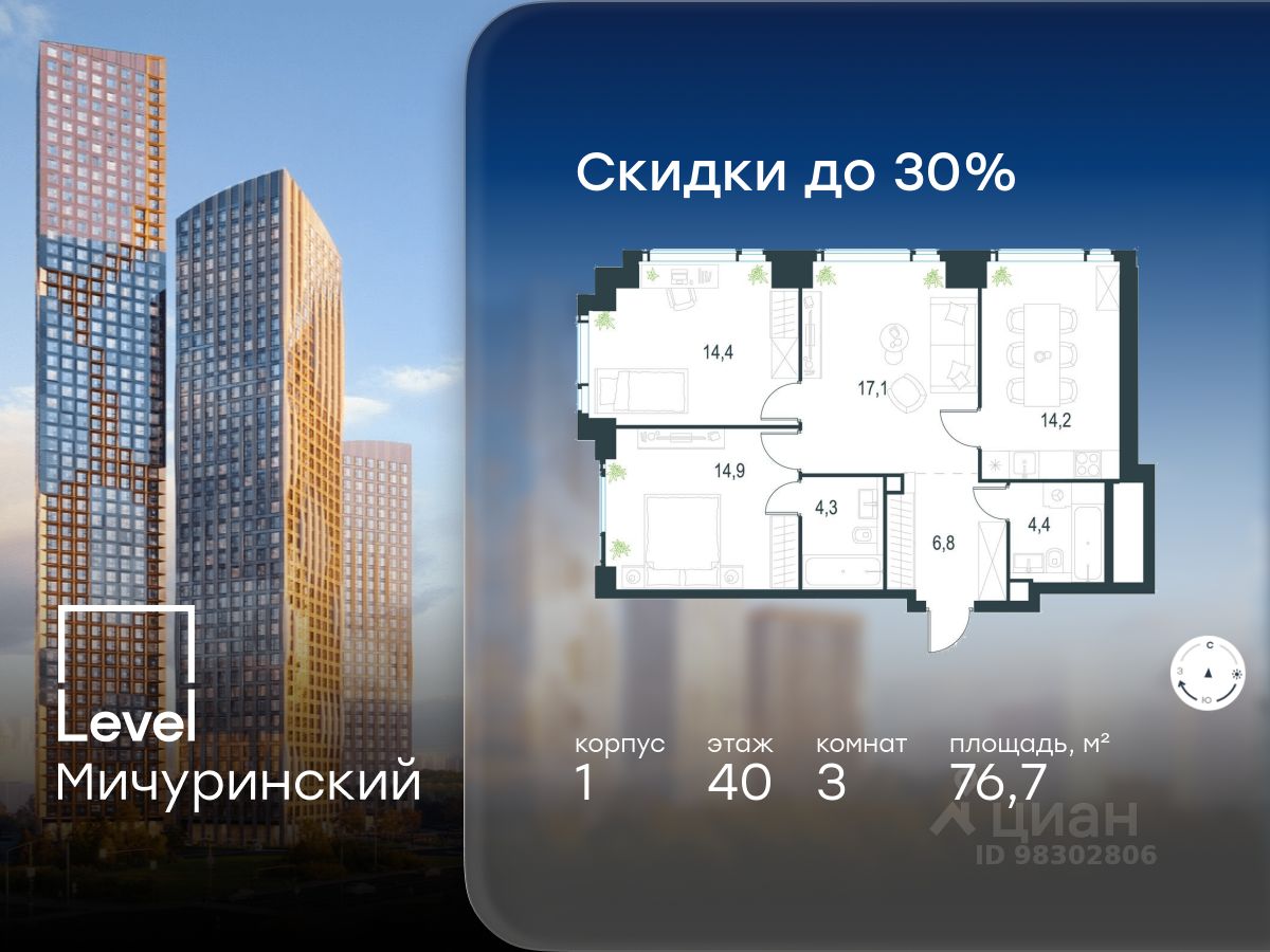 В жилом квартале, расположенном на границе с природным заказником ''Долина реки Очаковки'', продаётся 3-комнатная квартира площадью 76.70 кв.м без отделки. Квартира расположена на 40 этаже 54-этажного корпуса 1 в жилом комплексе бизнес-класса Level Мичуринский (компания Level Group/Левел групп).