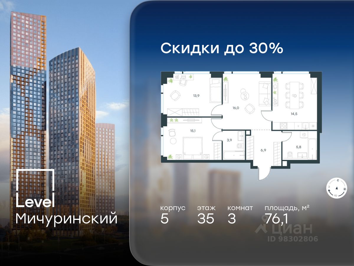 В жилом квартале, расположенном на границе с природным заказником ''Долина реки Очаковки'', продаётся 3-комнатная квартира площадью 76.10 кв.м с отделкой white box. Квартира расположена на 35 этаже 37-этажного корпуса 5 в жилом комплексе бизнес-класса Level Мичуринский (компания Level Group/Левел групп).