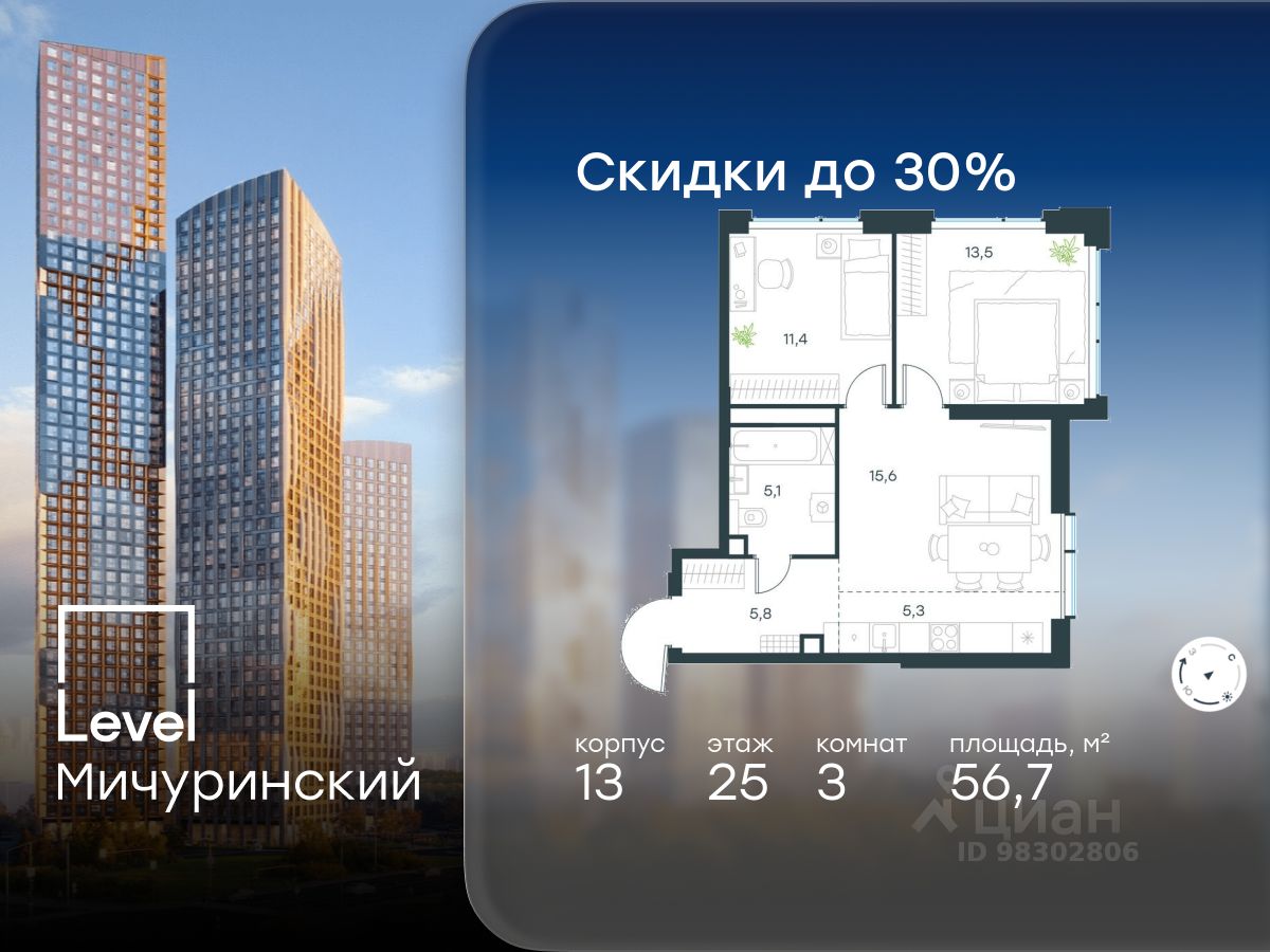 продам 3-к, Левел Мичуринский ЖК, 1331 833 898 ₽