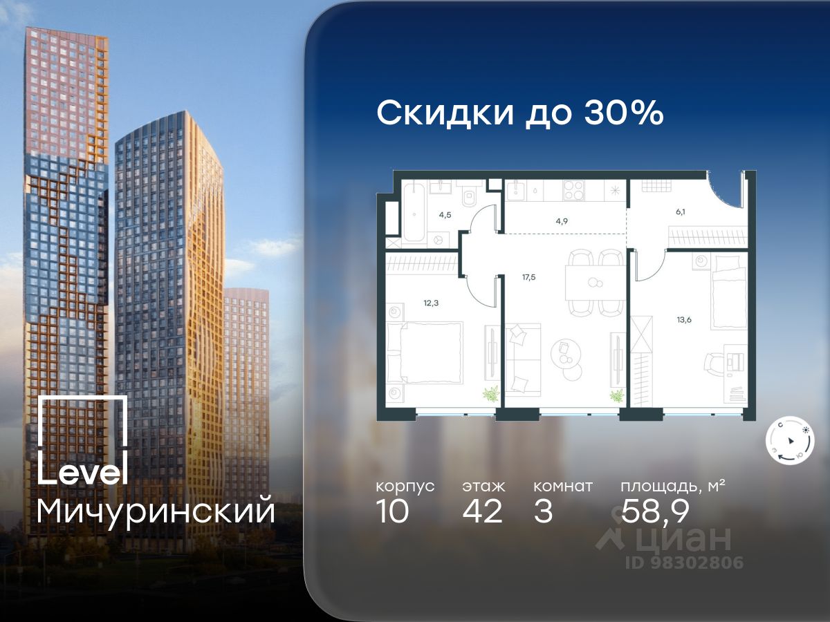 продам 3-к, Левел Мичуринский ЖК, 1034 167 835 ₽