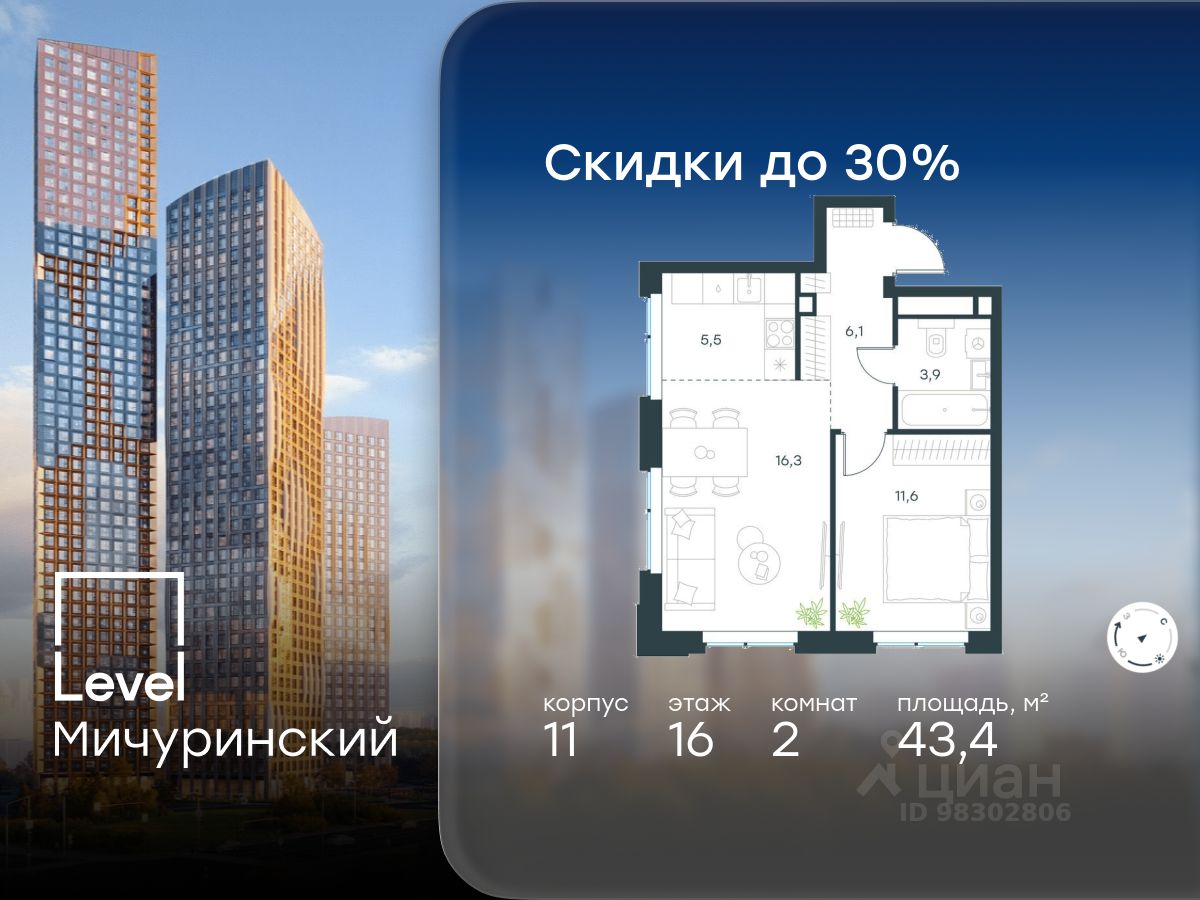 В жилом квартале, расположенном на границе с природным заказником ''Долина реки Очаковки'', продаётся 2-комнатная квартира площадью 43.40 кв.м с отделкой white box. Квартира расположена на 16 этаже 24-этажного корпуса 11 в жилом комплексе бизнес-класса Level Мичуринский (компания Level Group/Левел групп).