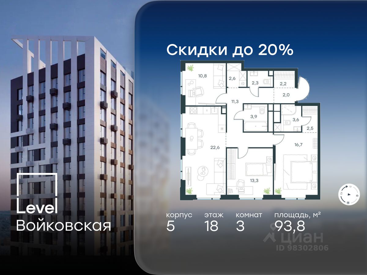 Продается 3-комнатная квартира площадью 93.80 кв. м без отделки. Квартира находится на 18 этаже 20-этажного корпуса 5, в новом жилом комплексе бизнес-класса Левел Войковская, расположенном рядом с живописным заповедником ''Покровское-Стрешнево'' (застройщик - компания Левел Group/Левел групп).