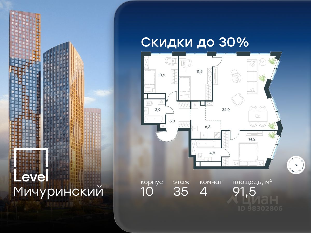 продам 4-к, Левел Мичуринский ЖК, 1057 479 106 ₽