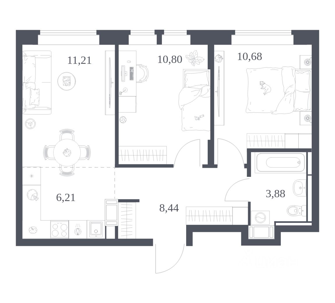 В отделочных работах используем проверенные материалы — сами ездим на завод и следим за качеством. Дизайн выдержан в классической, нейтральной цветовой гамме. В квартире есть всё необходимое от межкомнатных дверей до сантехники.