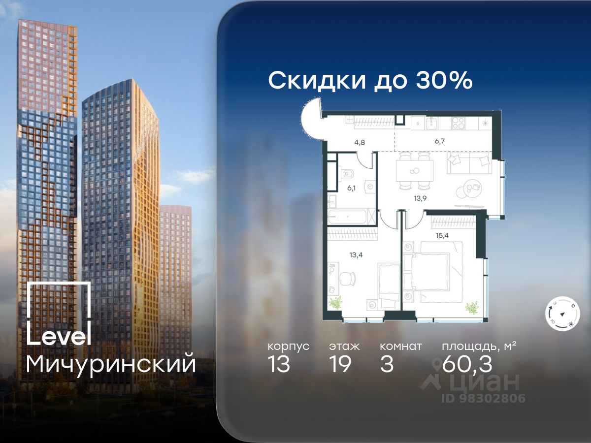 продам 3-к, Левел Мичуринский ЖК, 1335 903 968 ₽