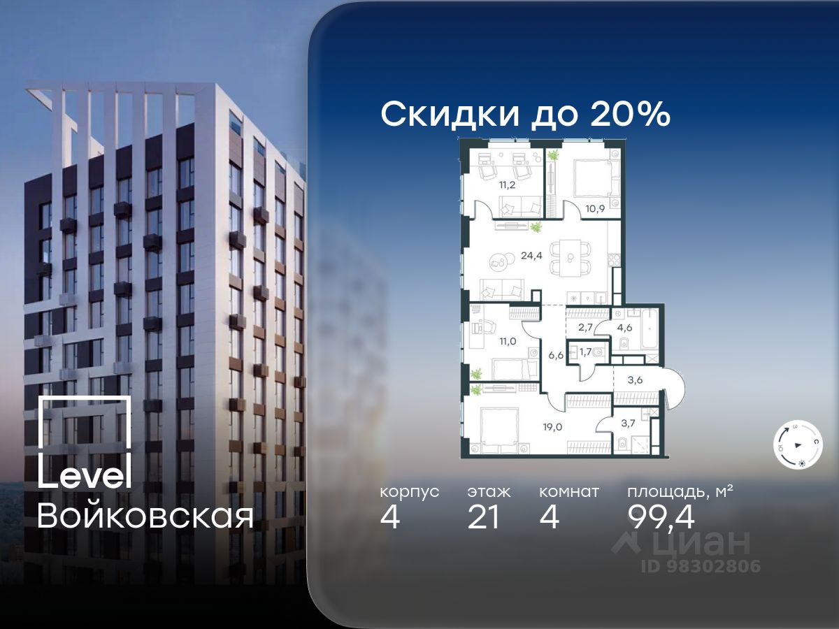 Продается 4-комнатная квартира площадью 99.40 кв. м с отделкой. Квартира находится на 21 этаже 26-этажного корпуса 4, в новом жилом комплексе бизнес-класса Level Войковская, расположенном рядом с живописным заповедником ''Покровское-Стрешнево'' (застройщик - компания Level Group/Левел групп).