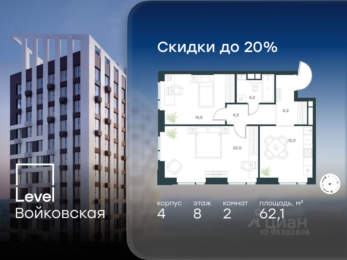 Продается 2-комнатная квартира площадью 62.10 кв. м с отделкой. Квартира находится на 8 этаже 26-этажного корпуса 4, в новом жилом комплексе бизнес-класса Level Войковская, расположенном рядом с живописным заповедником ''Покровское-Стрешнево'' (застройщик - компания Level Group/Левел групп).