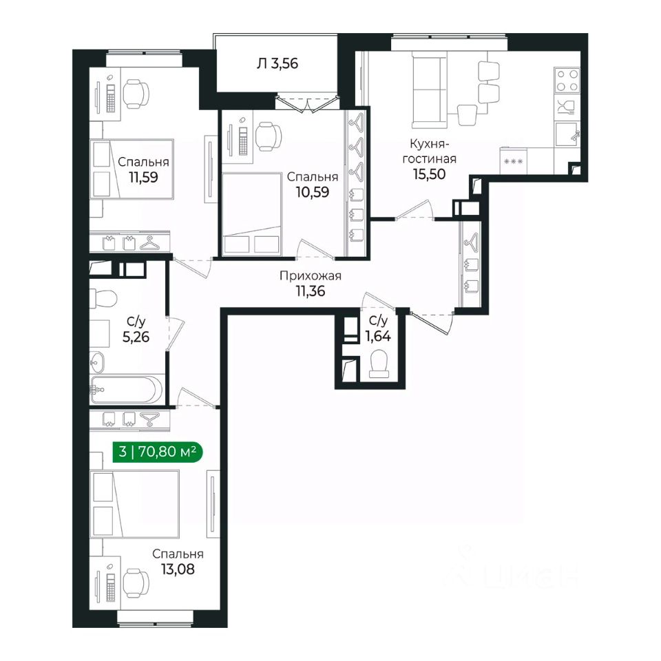 Просторная квартира для проживания большой семьи (еврочетырешка). Наличие трех отдельных комнат позволяет обустроить спальню, гостиную, детскую. Большая площадь кухни дает возможность разместить зону отдыха. Два полноценных санузла. Удобно для семьи с детьми. Система хранения во входной зоне.