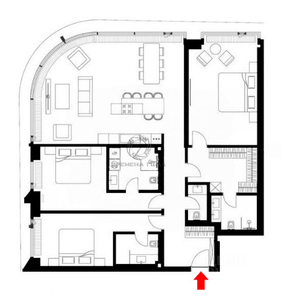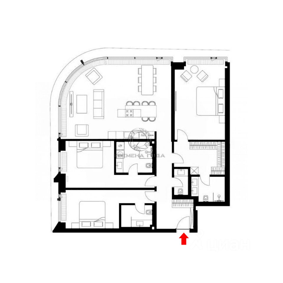Планировочное решение: кухня с обеденной зоной и гостиной, мастер спальня со своим санузлом и гардеробной, две спальни со своими санузлами, гостевой санузел, прихожая.