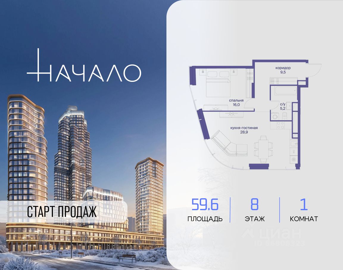 В престижном районе Пресня, на перекрестке делового и исторического центров Москвы, продается однокомнатная квартира площадью 59.60 кв. м без отделки. Квартира находится на 8 этаже 24-этажного дома, в новом элитном жилом комплексе ''Начало'' от девелопера ''Донстрой''. Реализация проекта запланирована на 1 квартал 2030 года.