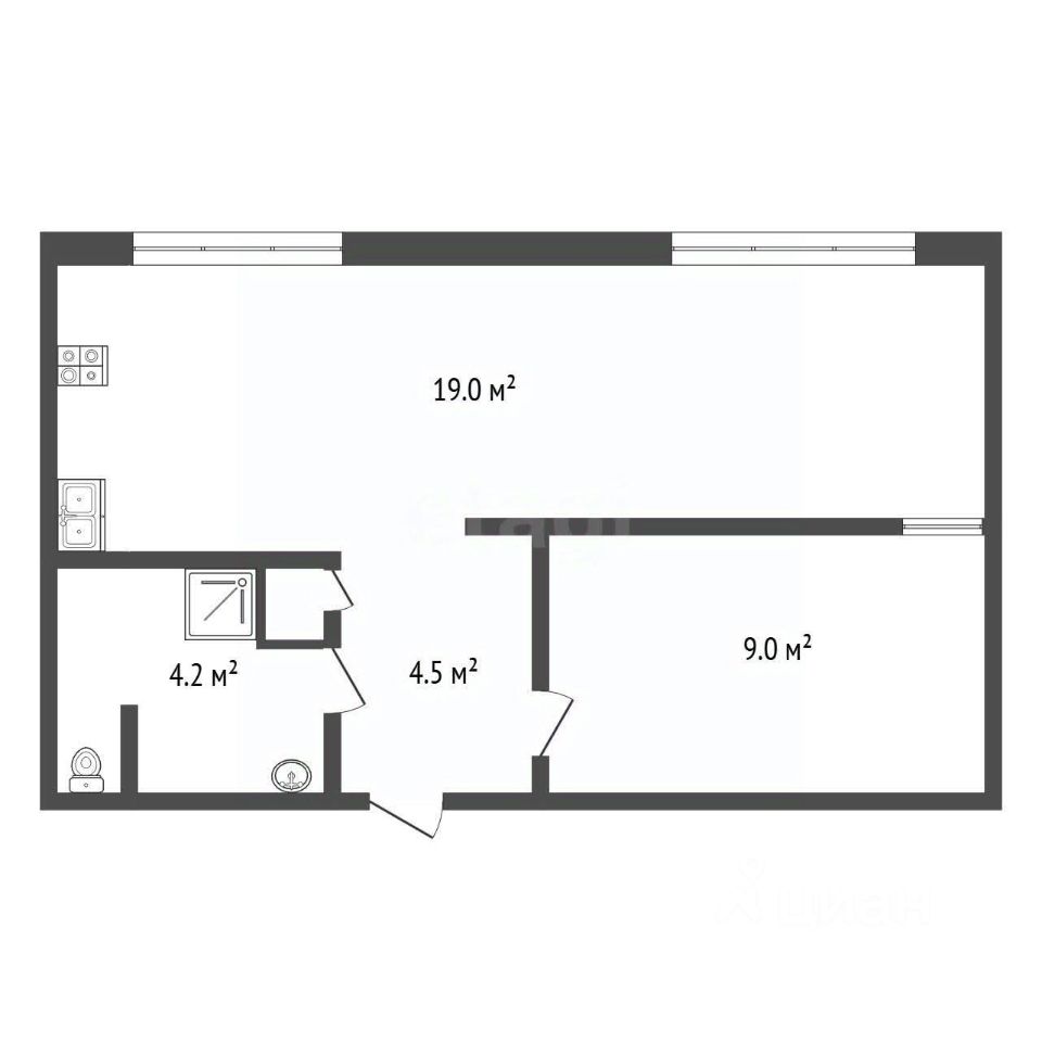 Стильная квартира с продуманной планировкой и почти завершённым ремонтом! • Просторная кухнягостиная 19 кв.м с двумя расширенными окнами и видом на реку - максимум света и воздуха. • В спальню мягко проникает дневной свет через декоративное окно высотой 1,8 м.