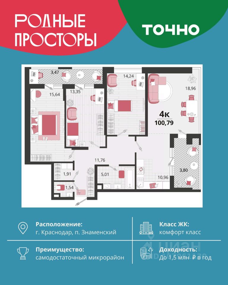 ''Родные просторы''- самодостаточный микрорайон, который реализован по принципу комплексного развития территории, где есть вся инфраструктура для комфортной жизни. На территории 41 га 29 домов от 9 до 24 этажей, уютные дворы со спортивными и игровыми площадками, социальные и коммерческие объекты, зеленые массивы и фонтаны. Главная точка притяжения ''Родных просторов'' - парк семейного отдыха площадью 9 га, 4,5 км прогулочных аллей, амфитеатр для мероприятий, кинофестивальная площадка. Особая гордость микрорайона современная школа на 1550 мест и 3 детских сада ''Ладушки'', ''Веснушки'' и ''Топотушки'' на 880 малышей. В центре микрорайона строятся фитнес-клуб BALANCE с акватермальным комплексом и собственная поликлиника, площадью более 5000 кв.м.
