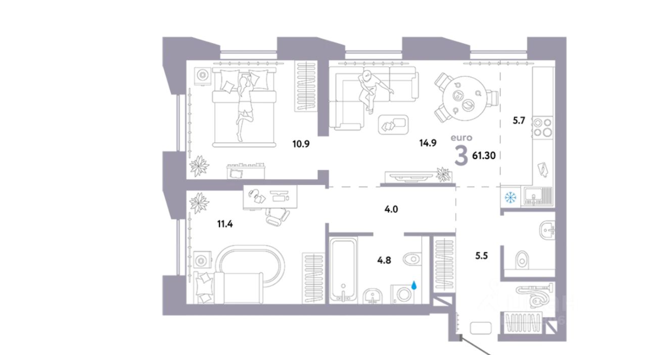 Квартира без отделки. Удобная планировка: две спальни, кухня-гостиная, два санузла. Эта квартира — идеальное решение для тех, кто хочет создать уникальное пространство, полностью соответствующее своим вкусам и потребностям.