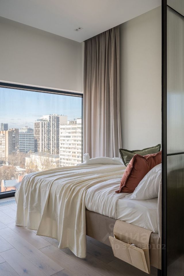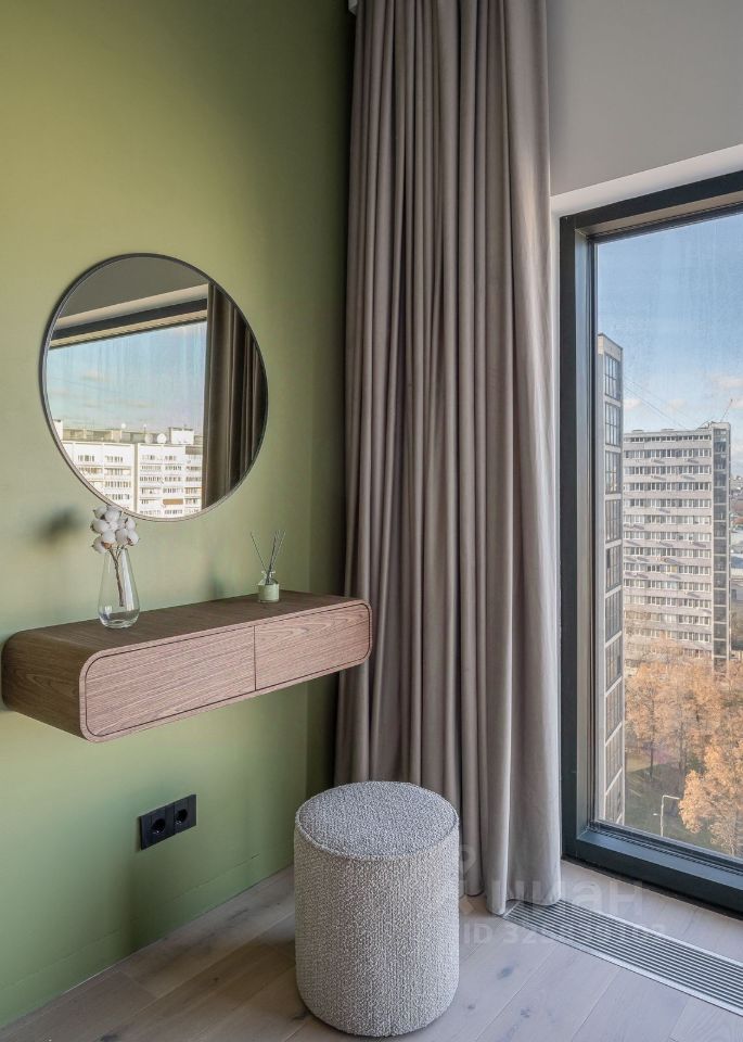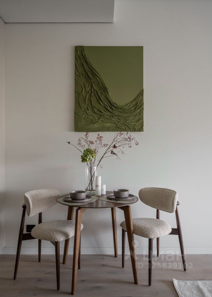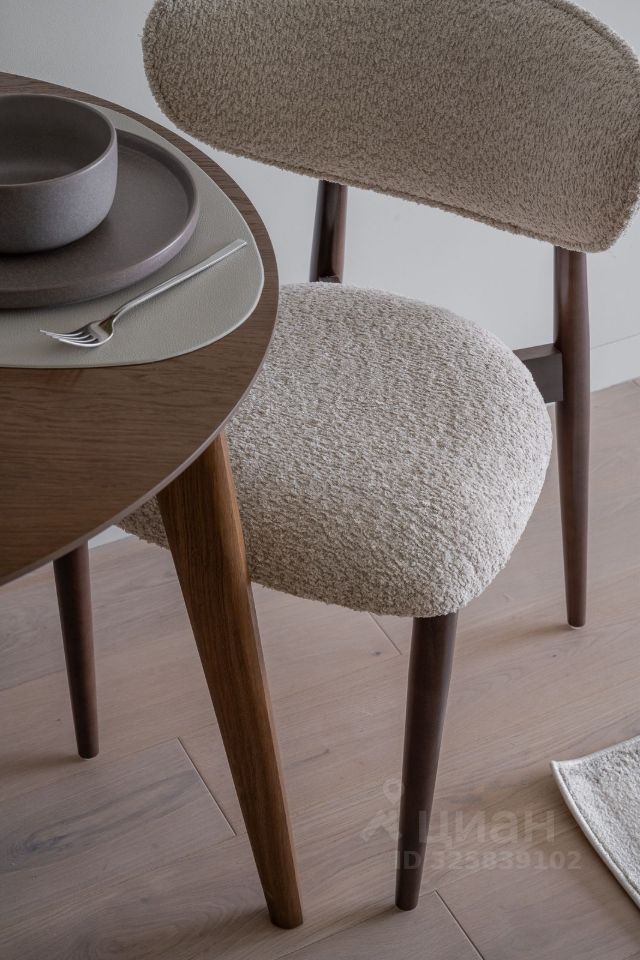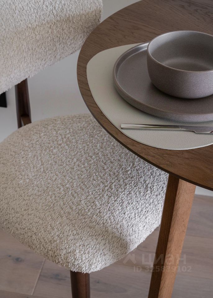 Интерьер выполнен в спокойной современной палитре: натуральное дерево, нейтральные оттенки, акцентные элементы. Кухня с интегрированной техникой, функциональная гостиная зона, панорамные окна наполняют квартиру светом и подчёркивают ощущение пространства.