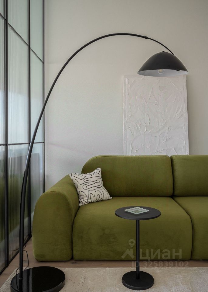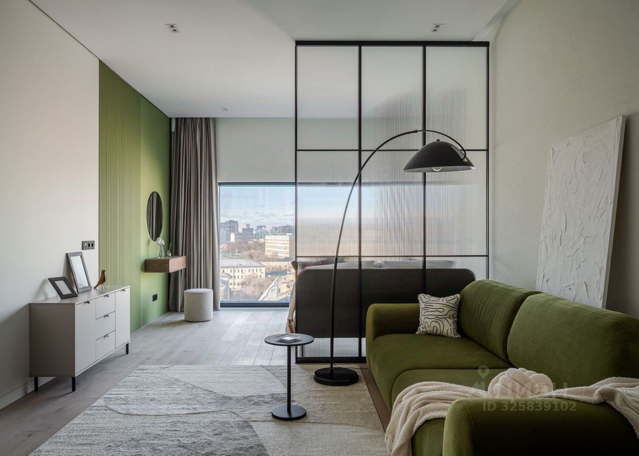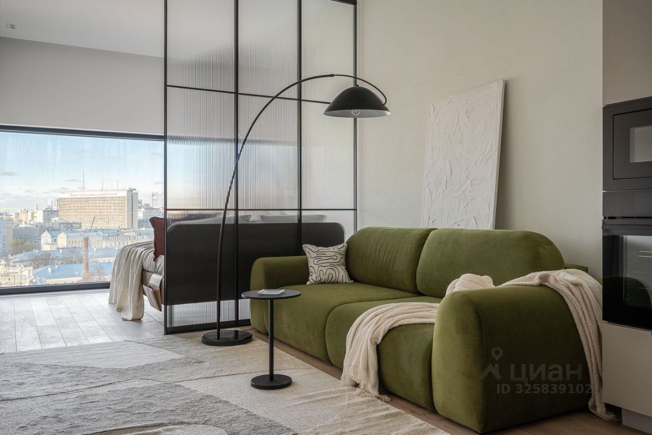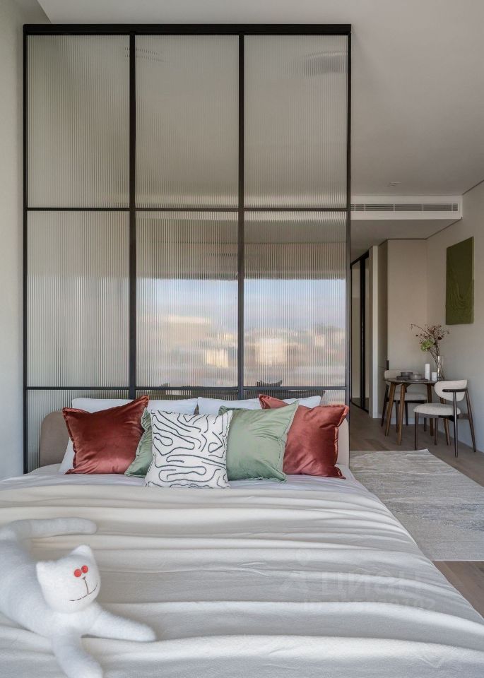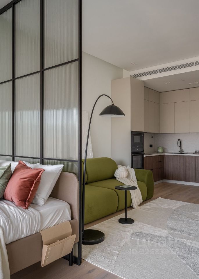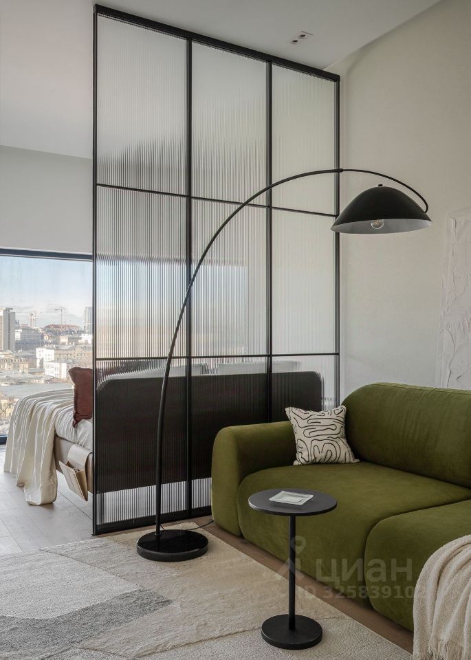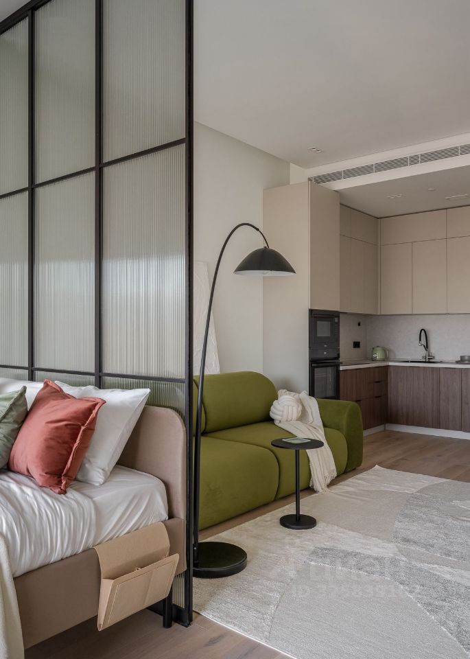 Стильная студия с продуманным дизайнерским интерьером. Пространство зонировано стеклянной перегородкой с рифлёным стеклом, что создаёт ощущение отдельной спальни при сохранении света и воздуха.